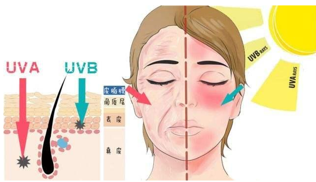 紫外线根据不同的生物效应,被划分为四个波段,其中能够穿透臭氧层,照射到人体的有UVA和UVB两个波段。UVA为长波紫外线,其穿透力强,可以透过玻璃,在照射皮肤后能够穿透表皮到达真皮浅层,发生反应后产生大量自由基,从而造成皮肤老化、色素沉积UB为中波紫外线,在到达地表前,会被大气层阻挡一部分,不能穿透玻璃皮肤接受大量UVB照射后会直接造成红肿、水疱等损伤。