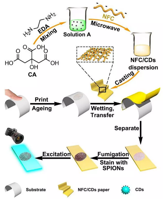 然而,指纹的提取往往受到真实环境的影响,导致部分信息缺失。用传统的方法很难从橡胶、布等表面粗糙的材料上检测到指纹。近日,国家纳米科学中心蒋兴宇研究员和查瑞涛博士等研究者在Nanoscale·Horizons上发表文章,报道了一种荧光纳米纤维化纤维素/碳点纸,可以从不同材质表面上高效的提取和检测潜在指纹,实现粗糙表面的指纹快速可视化。