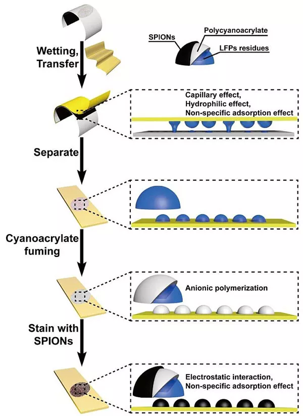 研究者进一步分析了NFC/CD纸转移和检测指纹的机理。潜在指纹的残留物可以通过毛细效应、亲水效应和非特异性吸附效应粘附在NFC/CD纸上;氰基丙烯酸酯熏蒸时,会与残留物反应,通过阴离子聚合生成聚氰基丙烯酸酯,有效地消除了干扰信息;超顺磁性氧化铁纳米粒子则是通过静电相互作用和非特异性吸附实现染色,可以让指纹更清晰地显示出来。为了测试NFC/CD纸的灵敏度,研究者用它获取的潜在指纹中的汗孔特征与实际手指进行比对。可以看到,NFC/CD纸检测的指纹中,汗孔可以准确地成像,尺寸分布在21-46μm之间,与手指上实际汗孔46-57μm的尺寸分布虽有差距,但位置分布完全吻合。指纹三维模型可以有效消除背景信号的干扰,显著提高对比度。研究者将不同方法获得的指纹图像转换为三维模型以比较特征点,发现NFC/CD纸依然表现优秀,保留的特征点最多,丢失的细节信息最少,特别是在橡胶、布、纸的表面尤为出众。研究者还比对了几种用传统方法在不同材质表面上获得的指纹图像与在玻璃上通过标准方法(固定和染色)获得的指纹图像的相似度,结果表明传统的方法难以从粗糙的橡胶材质表面获取指纹(相似度低于30%),而使用NFC/CD纸以后,从橡胶材质表面上得到的指纹更加清晰,相似度超过60%。