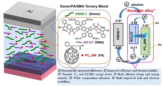 2020年7月,该课题组基于新型小分子受体材料的高效三元聚合物太阳能电池的研究成果发表在《材料化学C》(一区TOP期刊,影响因子7.059),题目为“小分子/富勒烯受体合金:一种提高三元聚合物太阳能电池效率和热稳定性的有效策略”(Small-molecule/fullerene acceptor alloy: a powerful tool to enhance device efficiency and thermal stability of ternary polymer solar cells),如图1。第一作者硕士研究生尹攀,通讯作者是沈平教授。该论文通过引入新型小分子受体材料IDT-OT构筑了高效三元聚合物太阳能电池,研究表明,小分子受体和富勒烯类受体间形成的合金是该三元体系的光伏性能和热稳定性提高的根本原因。研究证实,该受体合金之间同时存在能量转移和电荷转移,其工作机理目前文献罕见报道。早在2018年10月,该课题组就在基于小分子受体材料的高效三元聚合物太阳能电池方面的取得了很好的研究成果,在《材料化学A》(一区TOP期刊,影响因子11.301)上发表了题为“引入新型七环非富勒烯受体构筑高效厚膜和大面积的三元聚合物太阳能电池”(Achieving efficient thick active layer and large area ternary polymer solar cells by incorporating a new fused heptacyclic non-fullerene acceptor)的研究论文(图2)。论文的第一作者硕士研究生尹攀,通讯作者是沈平教授,苏州大学的崔超华副教授为共同通讯作者。该成果通过在二元聚合物太阳能电池中引入新型七环小分子受体材料DTCFOIC构筑了高效的厚膜和大面积的太阳能电池器件,这一特征表明该三元体系在有机太阳能电池的大规模生产制备方面具有很大的应用潜力。