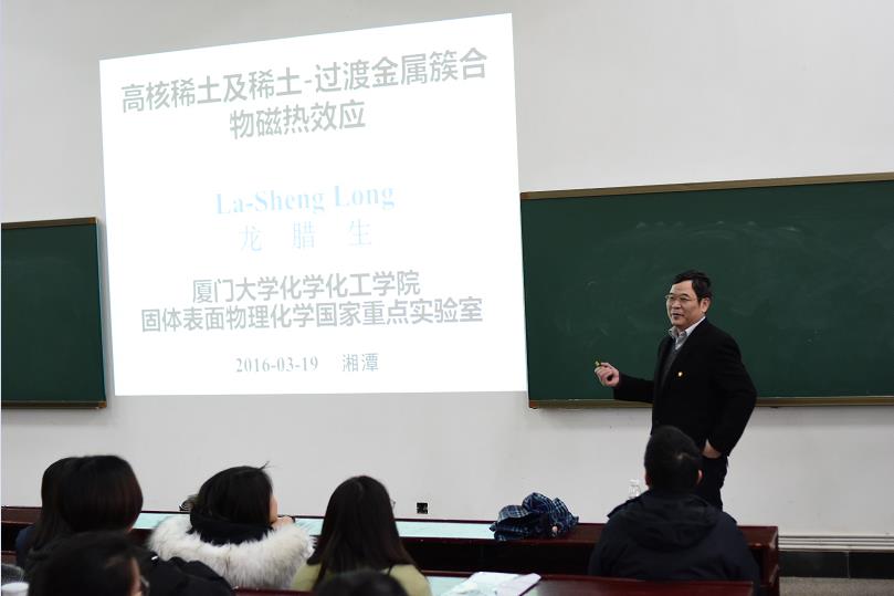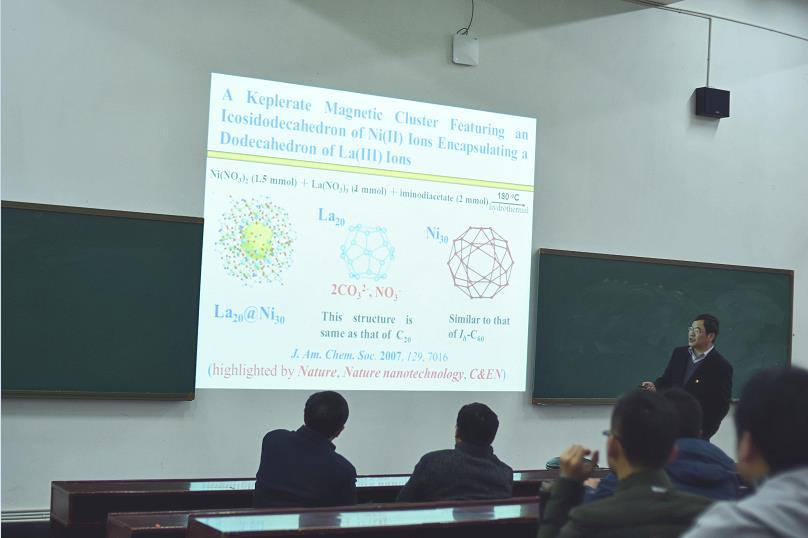 本次报告的主题是高核稀土、稀士-过渡金属簇合物的合成及磁热效应研究。龙腊生教授首先向我们讲解了磁热效应的作用机理,以及研究前景,然后较详细的介绍了他的课题组在此领域的研究进展和成果。通过龙教授的报告,我们了解到他的课题组目前在此领域处于世界领先地位,为磁热效应领域的发展做出了突出贡献。最后龙教授还跟我们分享了他的科研心得:“山穷水复疑无路,柳暗花明又一村”,在遇到难以逾越的困难时,心存希望,始终相信在不断的努力和探索下,一定会找到解决问题的途径。