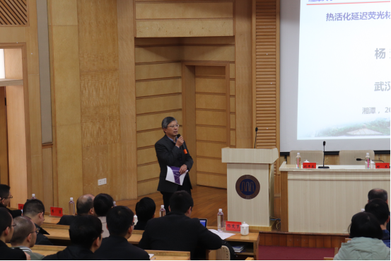 杨楚罗教授长期从事有机高分子光电功能材料的研究,近年来先后主持国家科技部973计划课题(课题负责人)、国家自然科学基金委重点项目等省部级研究项目30余项。杨楚罗教授主要介绍了热活化延迟荧光材料在不同领域具有广泛的应用,表示有机发光二极管已成为最具有前景的显示和照明技术,以及有机发光二极管重大需求背景、国家战略性新兴产业,并从两个部分来介绍自己的相关工作。第一部分,热活化延迟荧光材料发光器在有机发光二极管中的应用,从基于新受体的热活化延迟荧光材料发光器,热活化延迟荧光材料和聚集诱导发射器,热活化延迟荧光材料和激发态分子内质子转移发射器,热活化延迟荧光材料树形分子和热活化延迟荧光材料聚合物等六个方面进行详细阐述;第二部分,热活化延迟荧光材料发光器在细胞成像中的应用。最后杨楚罗教授总结了工作中对一系列的热活化延迟荧光材料发光器新的发展,获得了场下师生的热烈掌声。