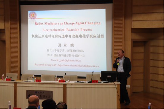 夏永姚教授主要从事新型储能材料和技术研究,当前主要研究方向是锂(钠)离子电池、电化学电容器、下一代电池和新型液流电池及电解水等。夏永姚教授用直观明了的蜘蛛图展示了理想的锂离子电池六大特性,并介绍了提高电池电极材料的倍率特性的主要途径:选择离子、电子快速传输的材料;应用纳米材料和技术缩短传输途径和采用氧化还原对改变反应途径,以及从热力学状态,动力学过程和化学反应与电化学反应三个方面进行阐述。夏永姚教授以自己所做的这LiMnPO4 和 LiFePO4 两个体系所展开的一系列优化工作进行了报告以及小结了氧化还原介质可作为电化学活性物质来改善超级电容器的准电容。夏永姚教授报告完后还现场解答了师生的疑问。