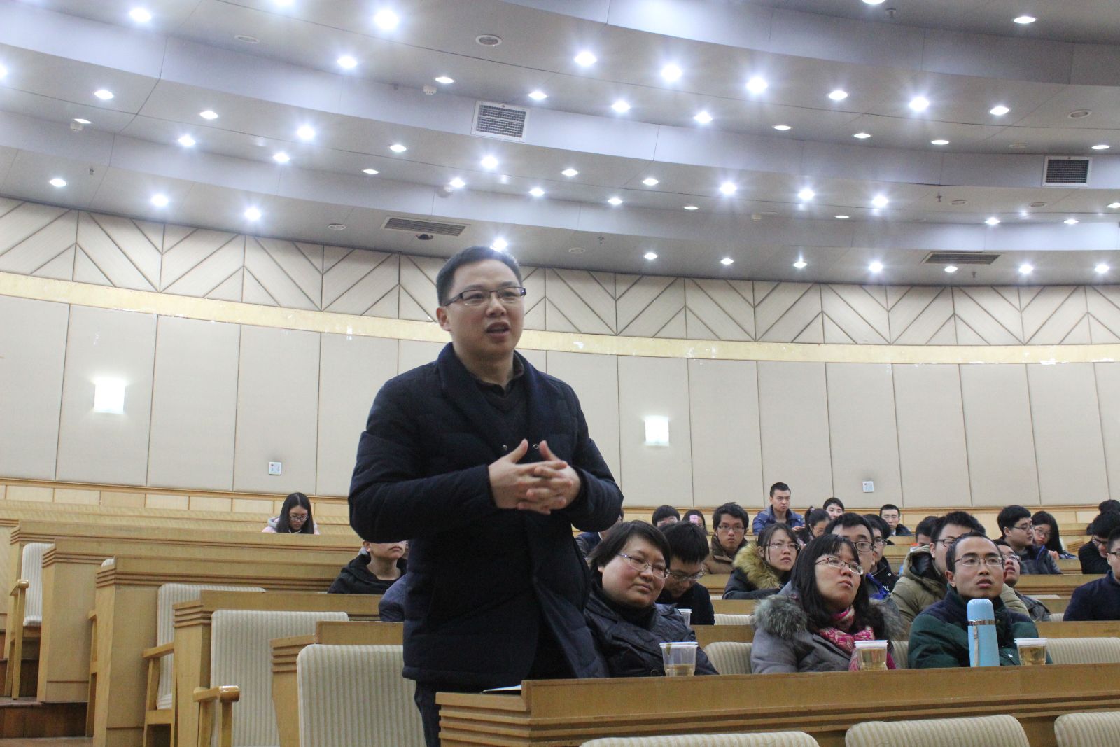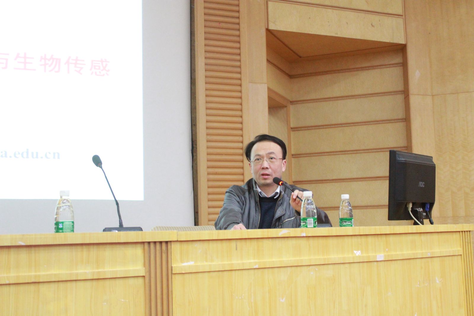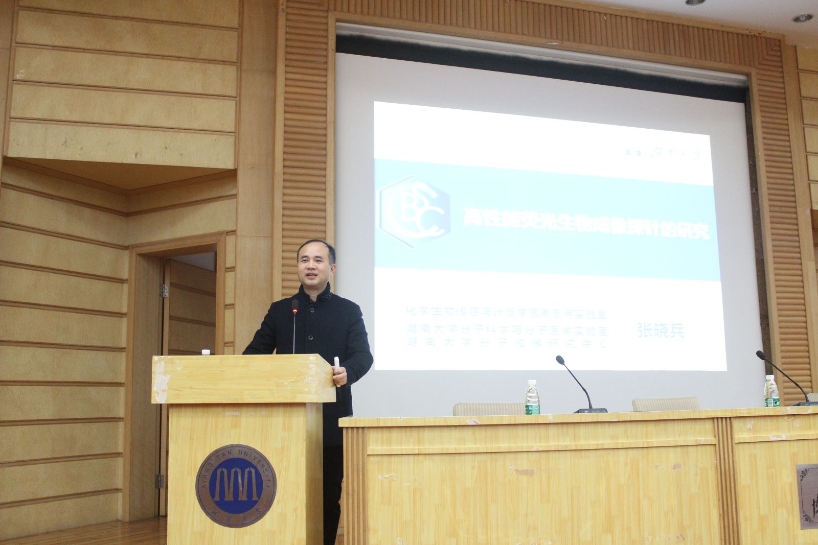 张晓兵教授讲授主题为“高性能荧光生物成像探针的研究”。从研究背景、小分子荧光成像探针研究进展和纳米荧光成像探针研究进展等几个方面进行了简要的介绍。最后根据自身经验提出了好论文的三个标准:1.要有创新点2.有质量的实验数据3.较好的写作水平。(刘洋坪提供照片)