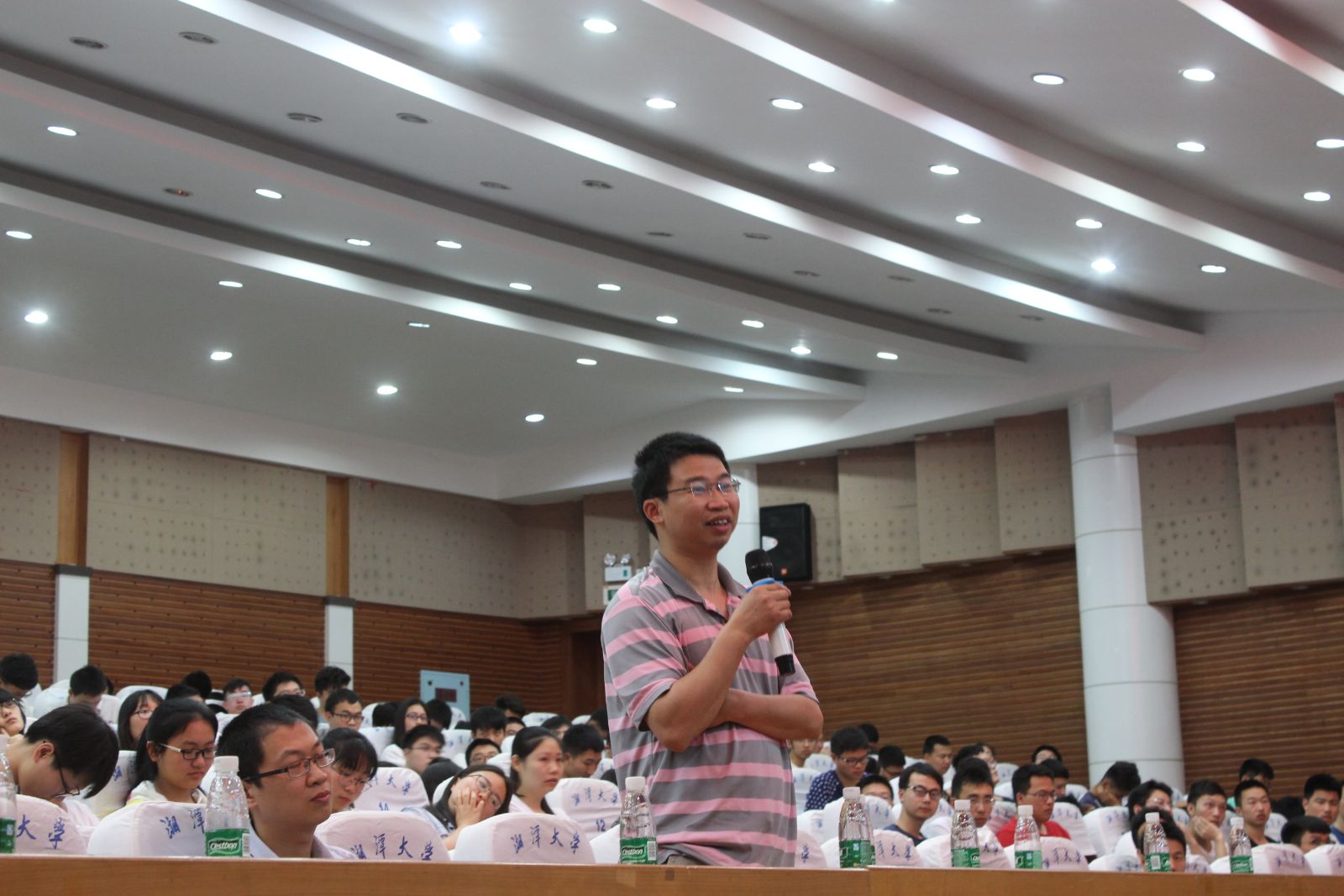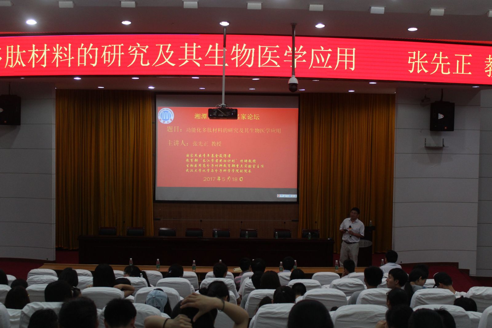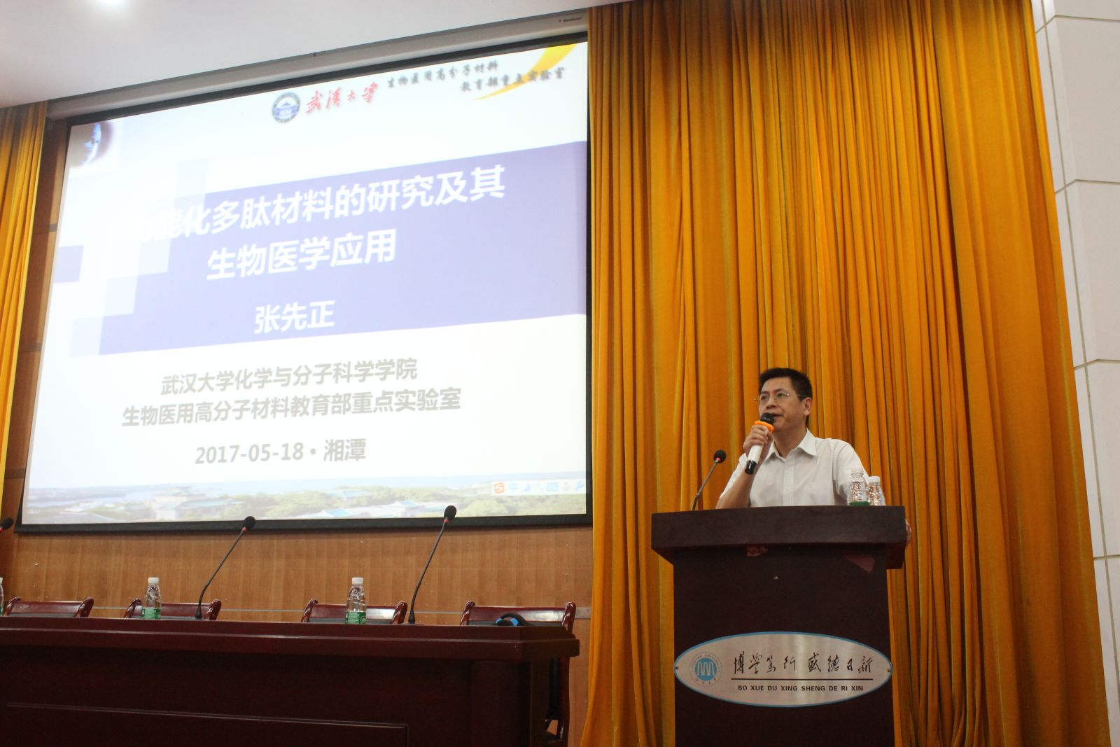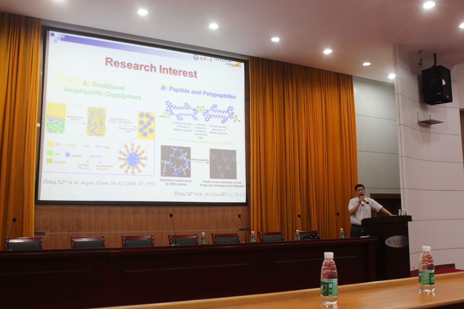 本次讲座的主题是“功能化多肽材料的研究及其生物医学应用”。主要介绍了多肽和蛋白质,讲解了张先正教授课题组关于对抗肿瘤药物的研究成果。(照片由刘洋坪提供)