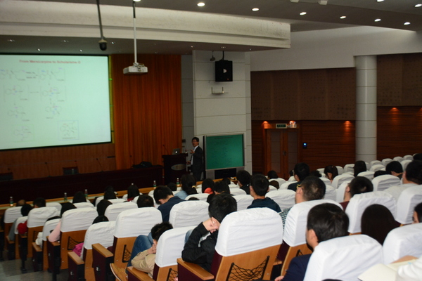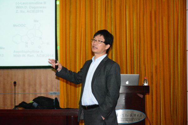 祝介平教授就题为“复杂分子的简约:从环戊烯到环生物碱”进行报告。祝教授以实例分析,从一个中间体如何合成多种天然产物,巧妙且详细的阐述“反合成切割”方法在有机合成上的运用。提问环节中,祝介平教授传授2015级研究生几点学习方法:每天坚持看全合成的文献,储备知识、要从未成功的有机反应中提取有用的信息,分析、积累经验,;要有耐心,恒心,沉下心去做科研。