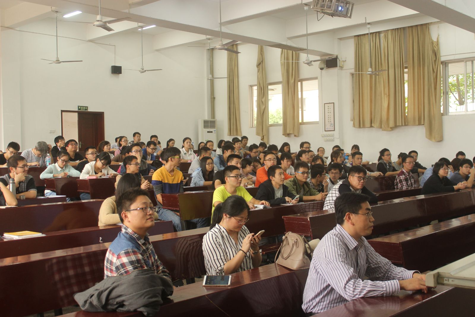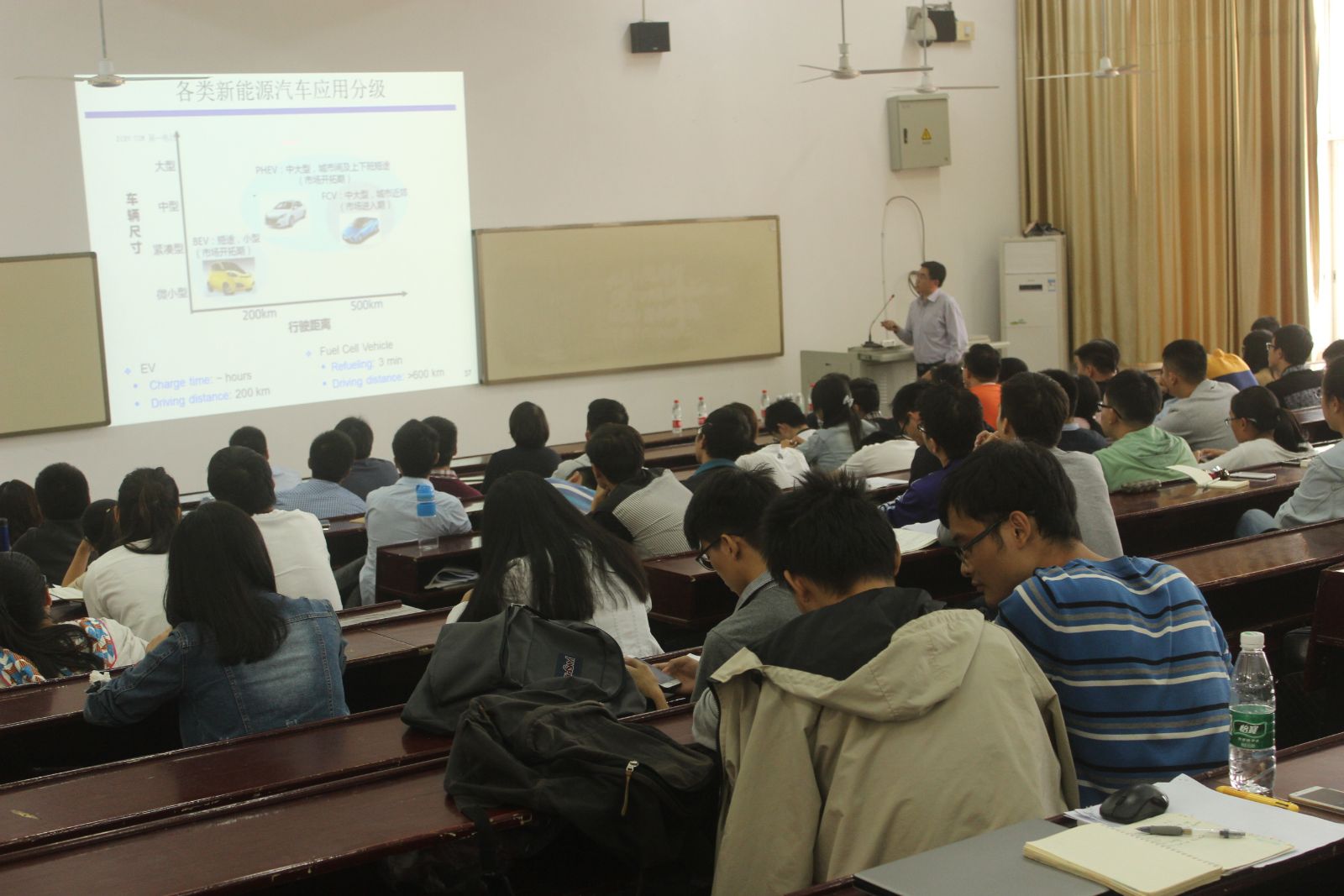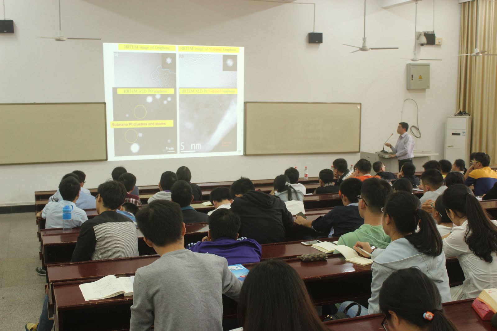 孙书会教授是加拿大(魁北克)国家科学研究院-能源、材料研究所终身教授,孙教授讲授主题为“Nanomaterials for Clean Energy Conversion and Storage ”。首先介绍了CVD、微波、水热法、电化学沉积法、ALD等几种构造纳米结构的方法,接着介绍了清洁能源对当今社会的重要性,并指出,清洁的燃料电池造价高,无法广泛应用。孙书会教授介绍了他的课题组对于解决清洁能源燃料电池造价高的问题所做的研究,即:通过改进燃料电池中的催化剂来改善这个问题,结合纳米结构,制作便宜的催化剂,制作成电极。这种催化剂拥有更高的活性,电极的稳定性更高。(照片由刘洋坪提供)