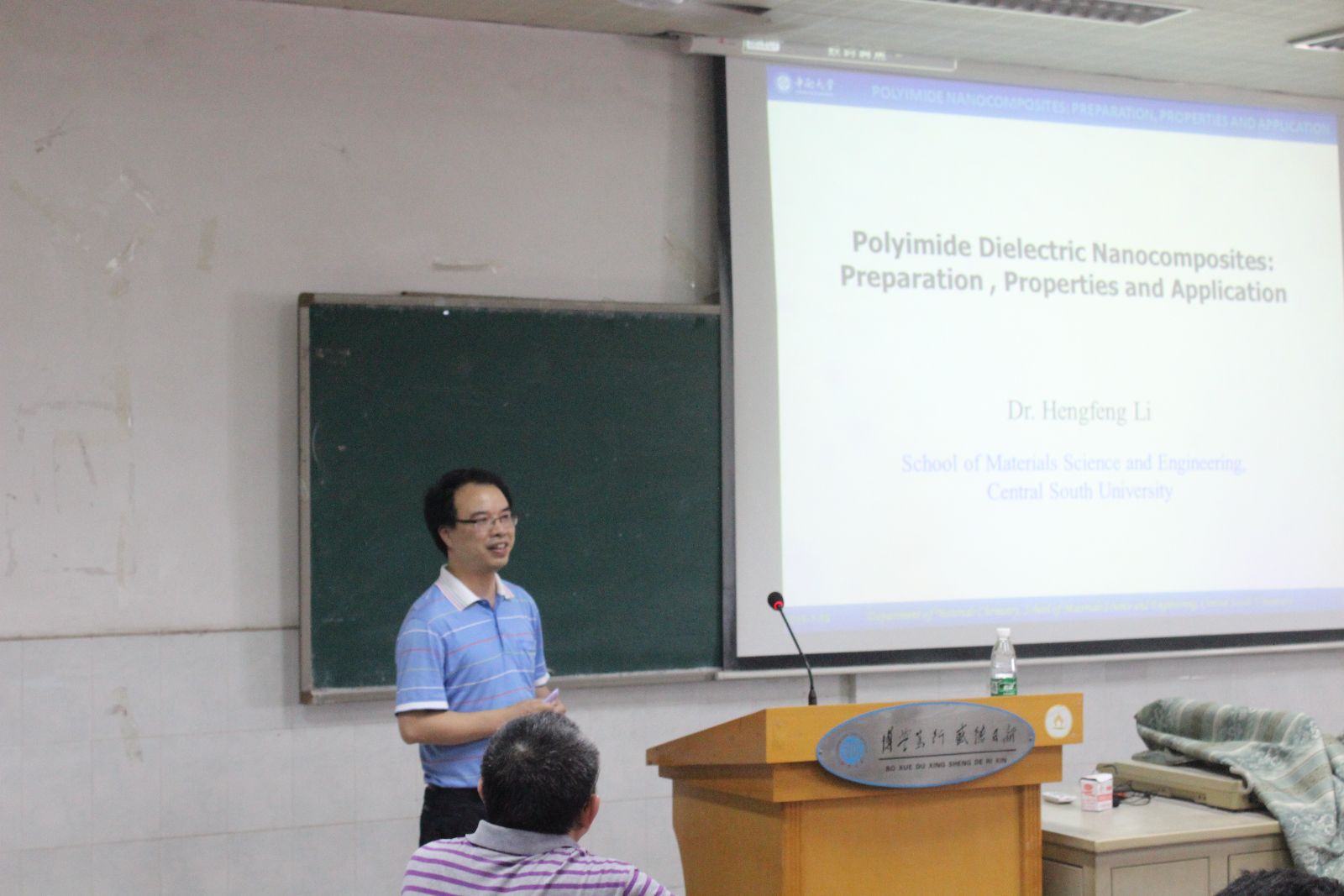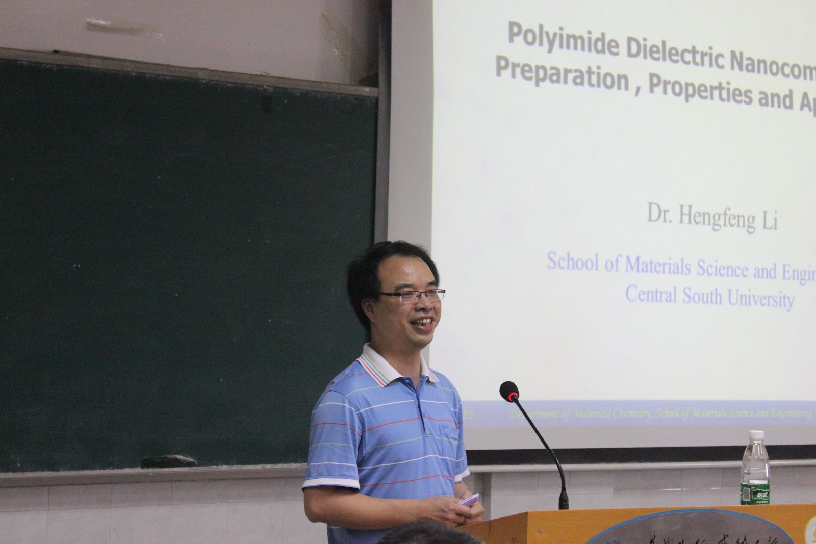 李衡峰教授以《Polyimide Dielectric Nanocomposites: Preparation, Properties and Application》为题,详细地介绍了聚酰亚胺(PI)/二氧化硅基复合材料、陶瓷/PI类复合材料、导电纤维/PI复合材料、碳纳米管/PI复合材料、石墨烯/PI复合材料、银纳米粒子/PI复合材料、银纳米线/PI复合材料等聚酰亚胺类复合材料的设计、合成、表征及其在有机合成催化和有机光电等研究领域的应用进展情况。报告后,李教授详细地解答了在场的老师和同学所提出的问题,并分享了自己多年科研的经验和体会。