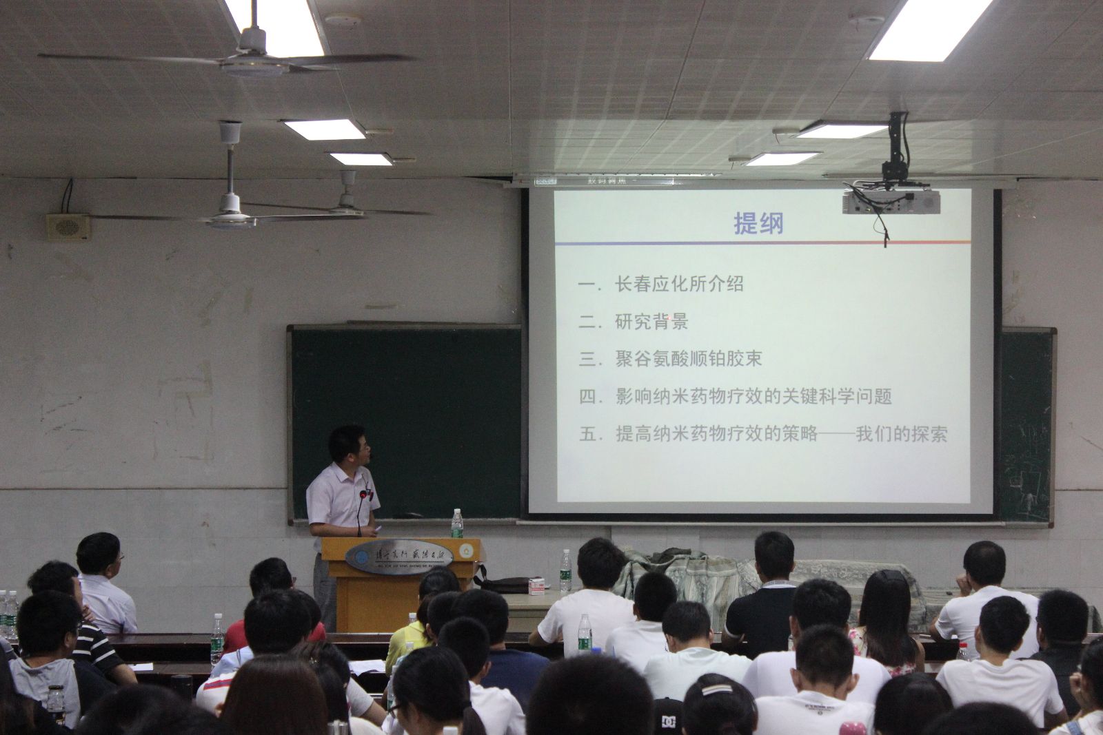 汤朝晖研究员以《高分子载体抗肿瘤纳米药物研究》为题,重点介绍了课题组近年来在聚合物抗肿瘤药的研究进展情况,详细地解答了影响高分子纳米药物疗效的关键科学问题,并提出了系列增强高分子纳米药物疗效的有效策略。报告后,张教授与老师和同学进行了深入的学术交流,并详细地解答了学生所提出的每一个问题。
