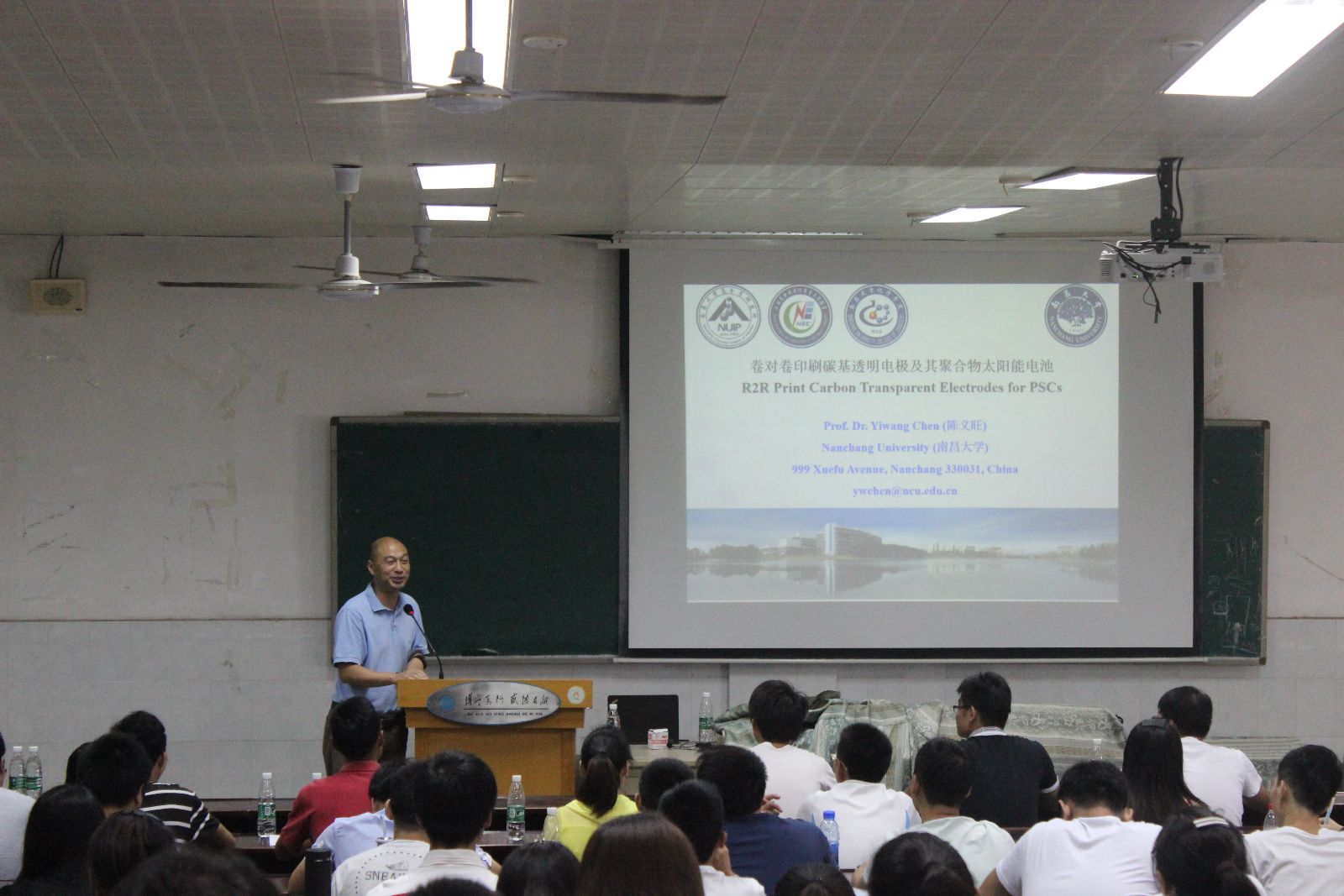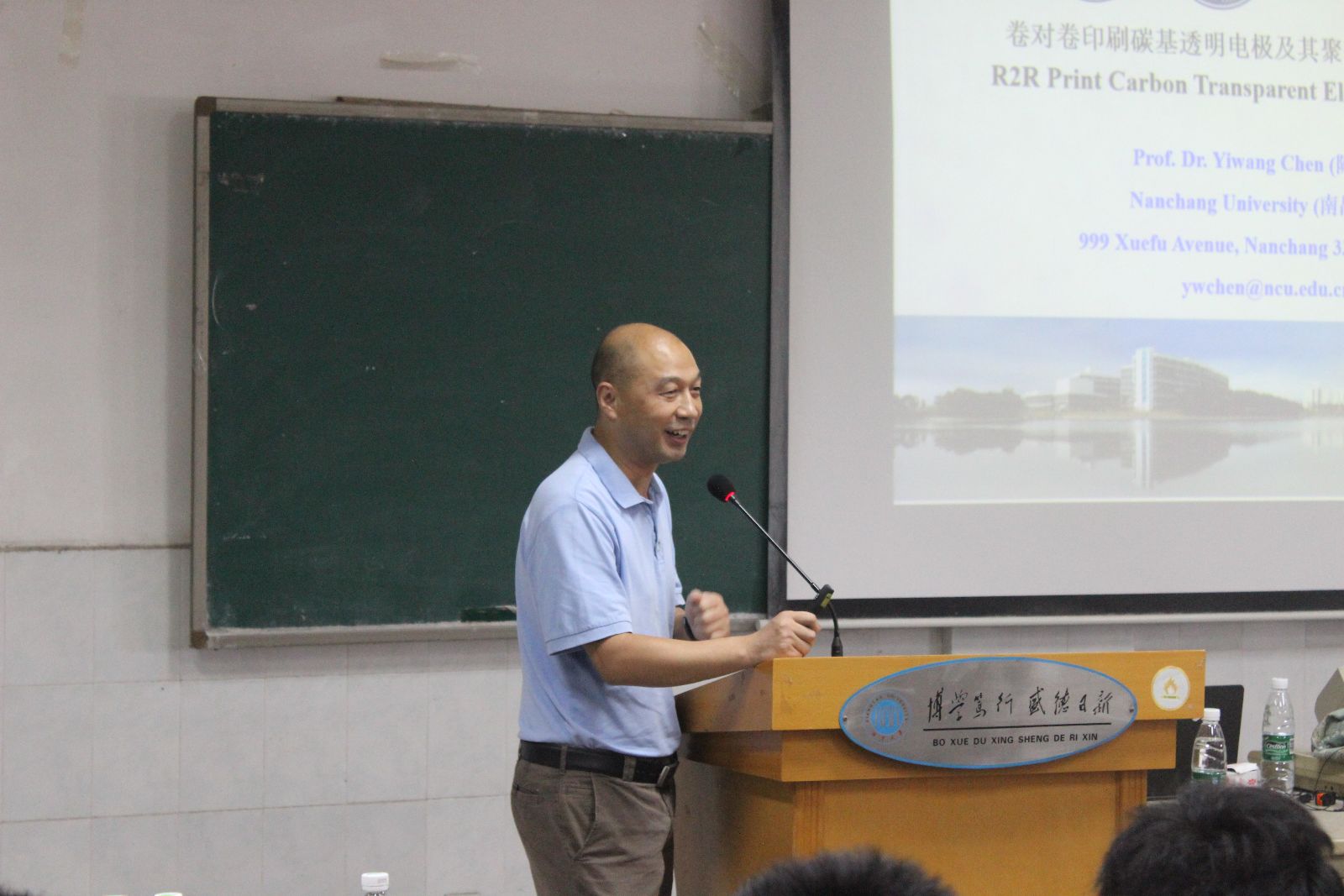 陈义旺教授就题为《卷对卷印刷碳基透明电极及其聚合物太阳能电池》作报告,主要内容为:可水/醇溶液加工界面材料;透明导电电极材料;柔性太阳能电池醇溶性加工材料与技术;高性能聚合物光伏材料的合成与性能研究;卷对卷大面积打印加工太阳能电池技术等。报告结束后,陈教授与在场老师和同学进行了亲切的交流和讨论。