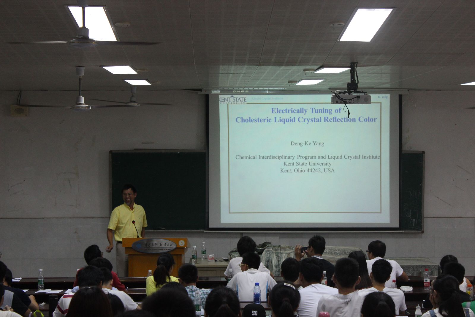 7月31日上午,在高分子材料应用技术湖南省重点实验室2015年学术年会上,美国肯特州立大学液晶研究所主任杨登科教授应邀做了一场题为《Electrically Tuning of Cholesteric Liquid Crystal Reflection Color》的讲座,伟德BETVLCTOR副校级督导员张海良教授主持本场报告。研究生院院长朱卫国教授,以及伟德BETVLCTOR相关专业的老师和研究生暑期学校的全体师生听取报告。