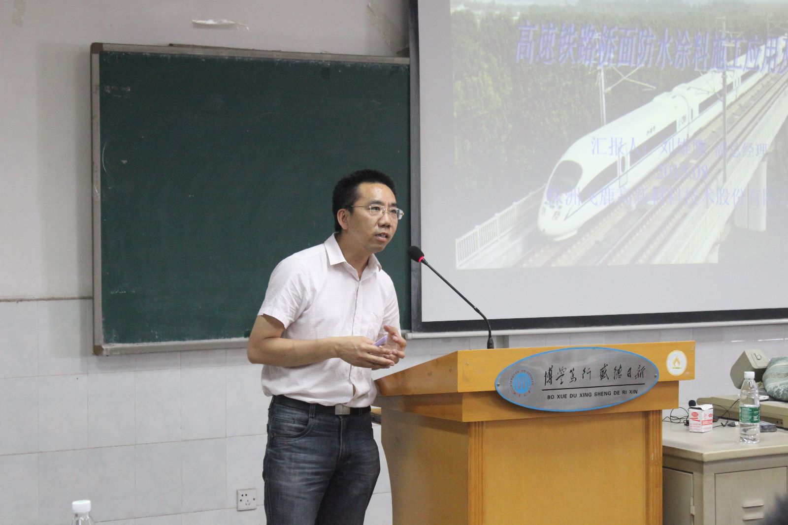 刘经理主要讲授了如下内容:高度铁路桥面防水设计;聚氨酯防水涂料性能与施工应用;喷涂聚脲防水涂料性能与施工应用;聚甲基丙烯酸甲酯防水涂料与施工应用;薄涂型改性聚氨酯防水漆与施工应用。刘经理详细讲解了高速铁路用防水涂料的设计、产品特性、施工方案等内容。本场讲座持续3个小时,精彩纷呈。报告后,刘经理与老师和同学进行了深入的学术交流,并详细地解答了学生所提出的每一个问题。