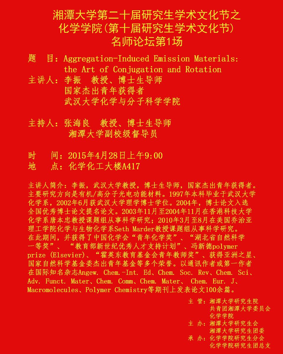 李振教授本次讲座的题目是:“Aggergation-Induced Emission Materials: the Art of Conjuation and Rotation”,主要介绍了有机光电材料方面的专业知识和相关应用。