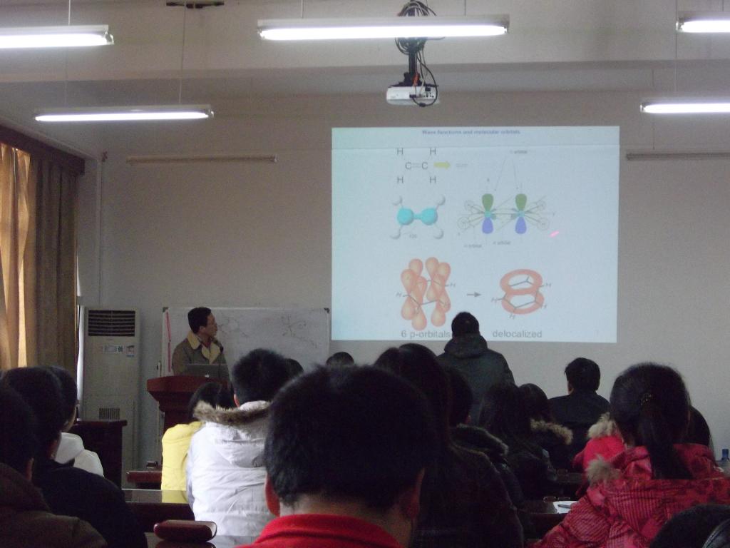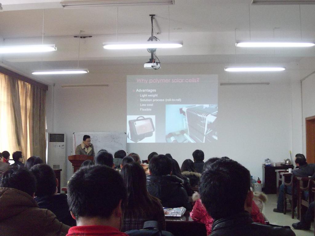 王二刚教授主要从事当今国际前沿课题——聚合物太阳能电池的研究,他围绕“窄带隙聚合物太阳能电池材料的研究”来展开讲座,现如今全世界都面临着能源的问题,而取之不尽用之不竭的太阳能具有很大的潜力,王二刚教授首先为我们介绍了聚合物太阳能电池的优越性——质量轻、成本低、可做成柔性器件。但是聚合物材料也有缺点,转化效率低、使用寿命短。鉴于此,王二刚教授从自己的研究成果详细地为我们介绍了结构优化改进材料从而提高转化效率。如何设计分子侧链以拓宽光谱吸收、提高载流子迁移率,选择适当的溶剂以改善表面形貌等。王二刚教授为我们介绍了一系列的研究成果,尤其是思路设计方面让我们受益匪浅。