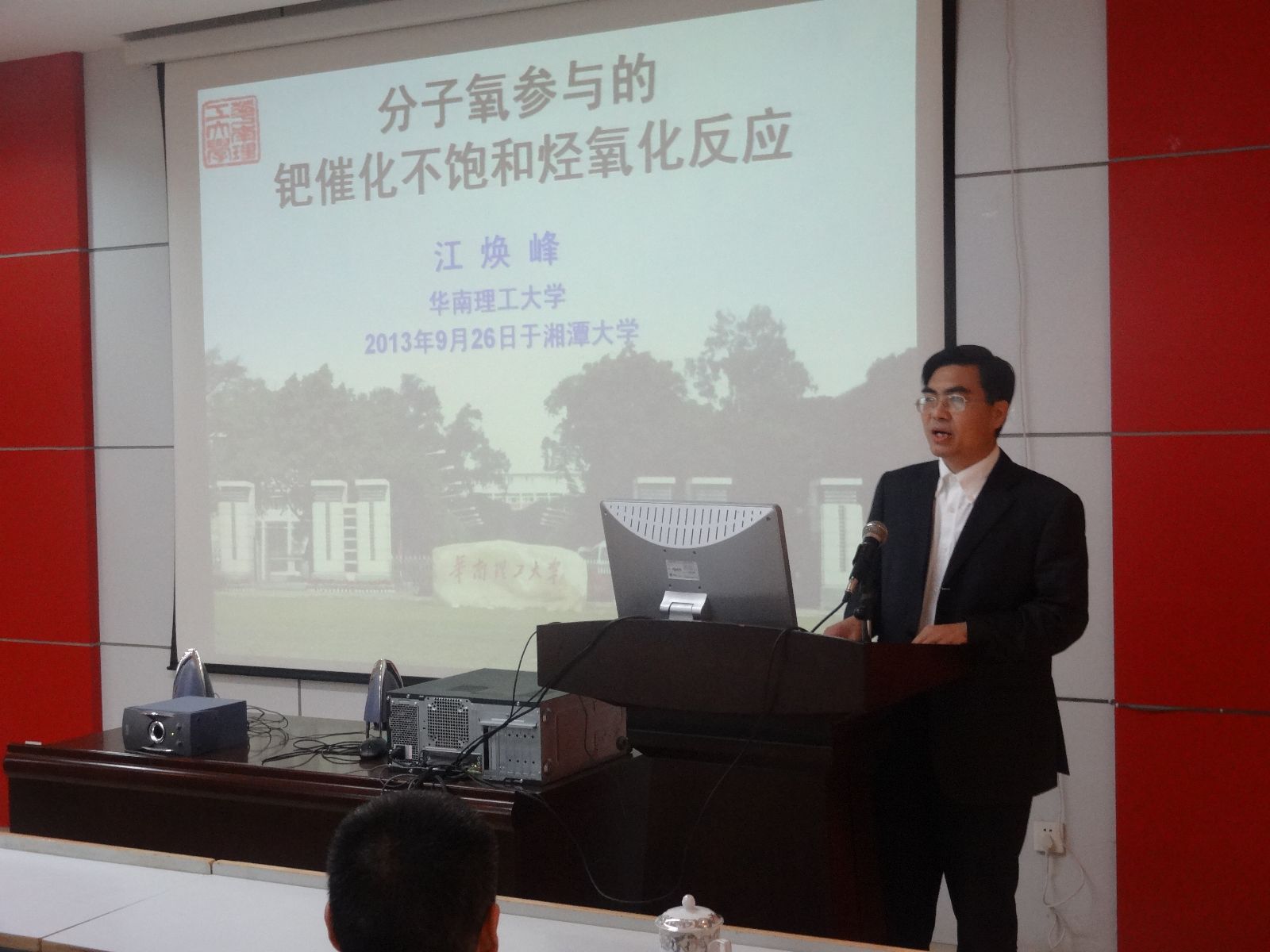 9月26日上午,中国化学会理事、广东省化学会副理事长、广东省化学会有机化学专业委员会主任、广东省“千百十工程”国家级培养对象、2006国家杰出青年基金获得者、华南理工大学博士生导师江焕峰教授做客“韶风·名家论坛”,在化学化工楼A208报告厅做了一场题为“分子氧参与的钯催化不饱和烃氧化反应”的讲座。伟德BETVLCTOR和化工学院部分教师、研究生听取讲座。伟德BETVLCTOR院长、博士生导师朱卫国教授主持讲座。