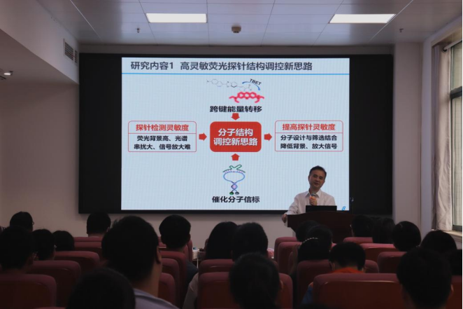 在这场学术讲座中,张晓兵教授分别从研究背景、高灵敏荧光探针结构调控新思路、高稳定纳米探针组装新原理、复杂体系精准成像新方法等几个方面向同学们介绍了荧光探针性能调控与生物成像应用的相关知识。其间,张教授生动地讲述了自己科研路上的一些小故事,以此就科研方法提出了独到的见解,并强调了科研人应该具有的精神。讲座内容开拓了同学们的研究思路,点燃了同学们科研热情。