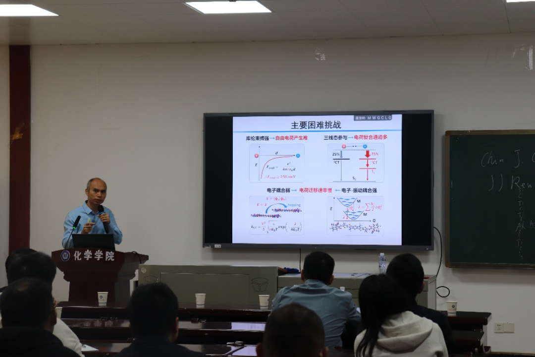 易院平教授指出有机光伏电池具有轻薄、柔韧、半透明、易加工等特点,在便捷式、集成式能源供给等方面展现重要的应用前景,但提高能量转换效率是新型有机光伏电池的迫切需求。易院平教授主要讲述了面向有机光电材料复杂体系,发展了载流子极化能、电子转移耦合、以及分子自组装的计算模拟方法,其次揭示了极化效应对高效有机光伏体系自由电荷产生的重要作用,阐明A-D-A受体的分子内和分子间电荷输运机制。报告最后易院平教授提出减小△EST有效抑制三线态电荷复合的分子间策略,进而以△EST为描述符建立精准预测有机光伏性能新模型。