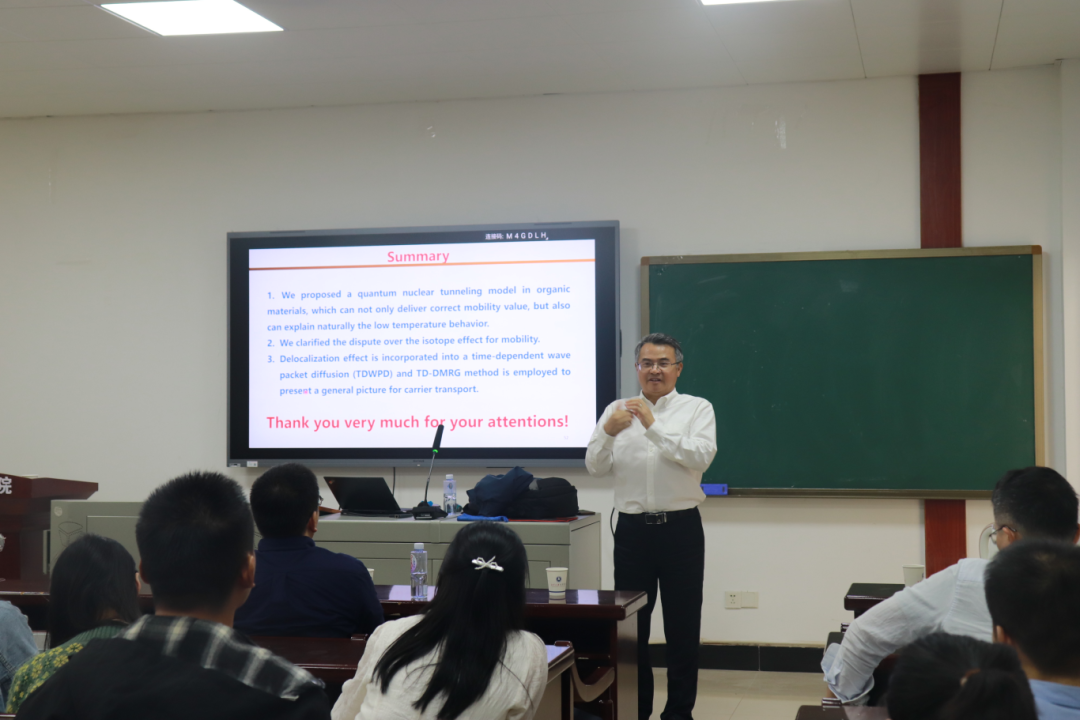 在此次报告中,帅志刚教授首先详细介绍了密度矩阵重正化群理论,即在矩阵积态(MPS)和矩阵积算子(MPO)的现代框架中TD-DMRG的基本算法,包括关于MPS和MPO的基本代数,传播MPS的新型时间演化方案,以及编码通用哈米顿量的自动MPO构造算法,表明该方法可以处理有限温度下的混合态密度矩阵,从而实现分子聚集的量子统计描述。随后进一步讲解有机材料中的量子核隧道模型,该模型不仅能提供正确的迁移率值,还能自然解释低温行为。同时指出可以将去局域化效应纳入时间相关波包扩散(TDWPD),采用 TD-DMRG 方法呈现载流子输运的图景。