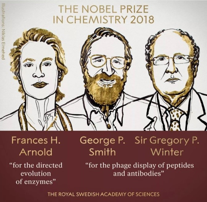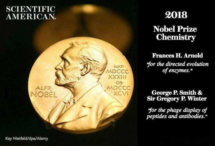 今年诺贝尔化学奖一半颁给弗兰西斯·阿诺德,奖励她实现了酶的定向演化;另一半颁发给乔治·史密斯和格里高利·温特,奖励他们实现了多肽和抗体的噬菌体呈现技术。