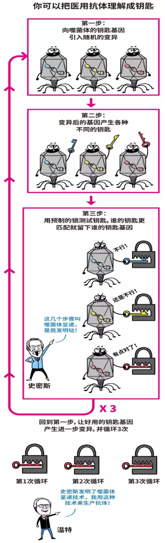 格雷格·温特建立了一个噬菌体库,其表面上有数十亿种抗体。从这个库中,他找到了附着在不同靶蛋白上的抗体。然后,他在定向进化抗体的帮助下升级了新的库,在这个库中的抗体与靶标的附着力更强。