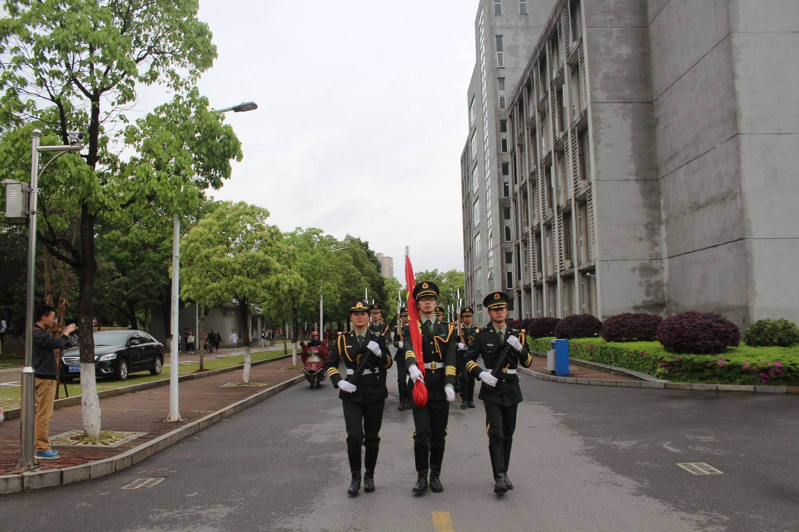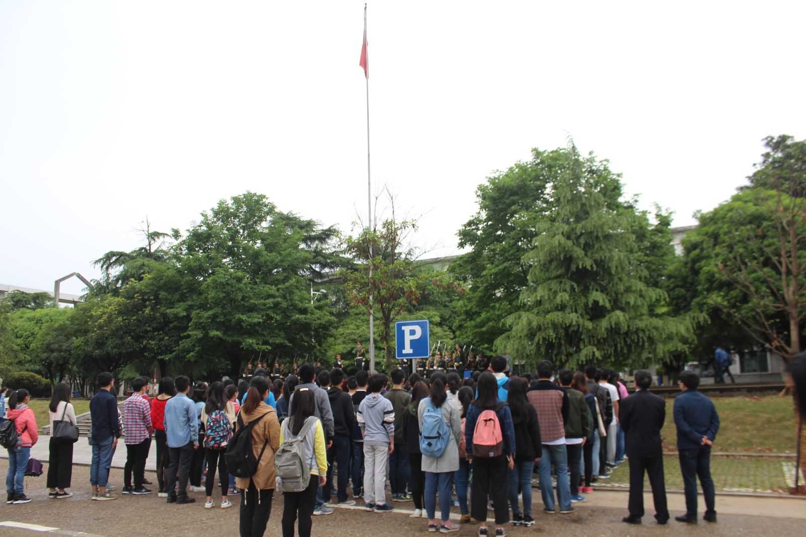 7点正,国旗护卫队队员踏着整齐步伐,护送国旗走向旗杆下前的升旗台。大家庄严肃立,伴随着慷慨激昂的《义勇军进行曲》,注视国旗冉冉升起,最后在旗杆顶端迎风飞扬。