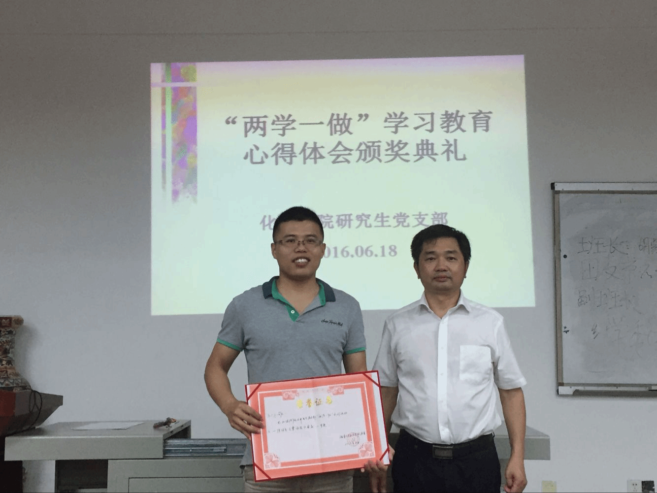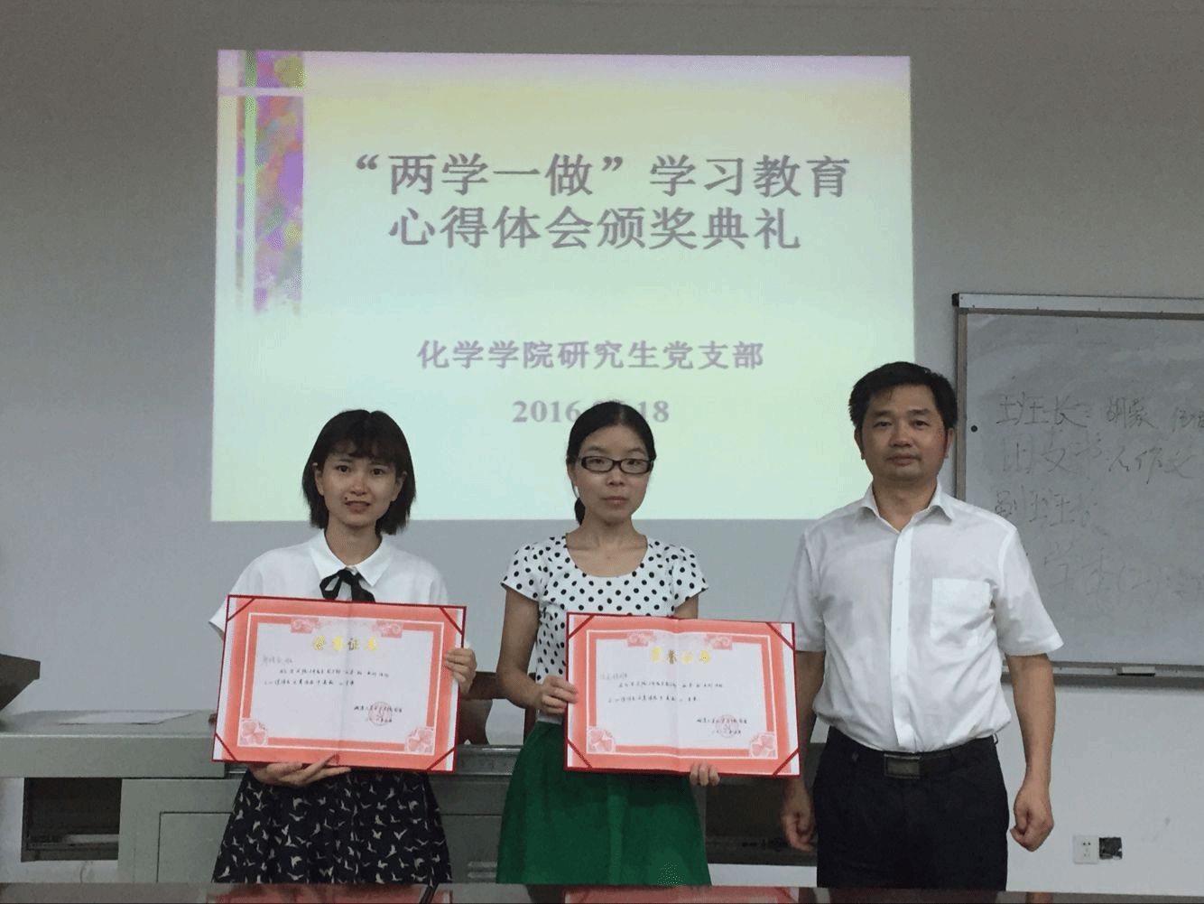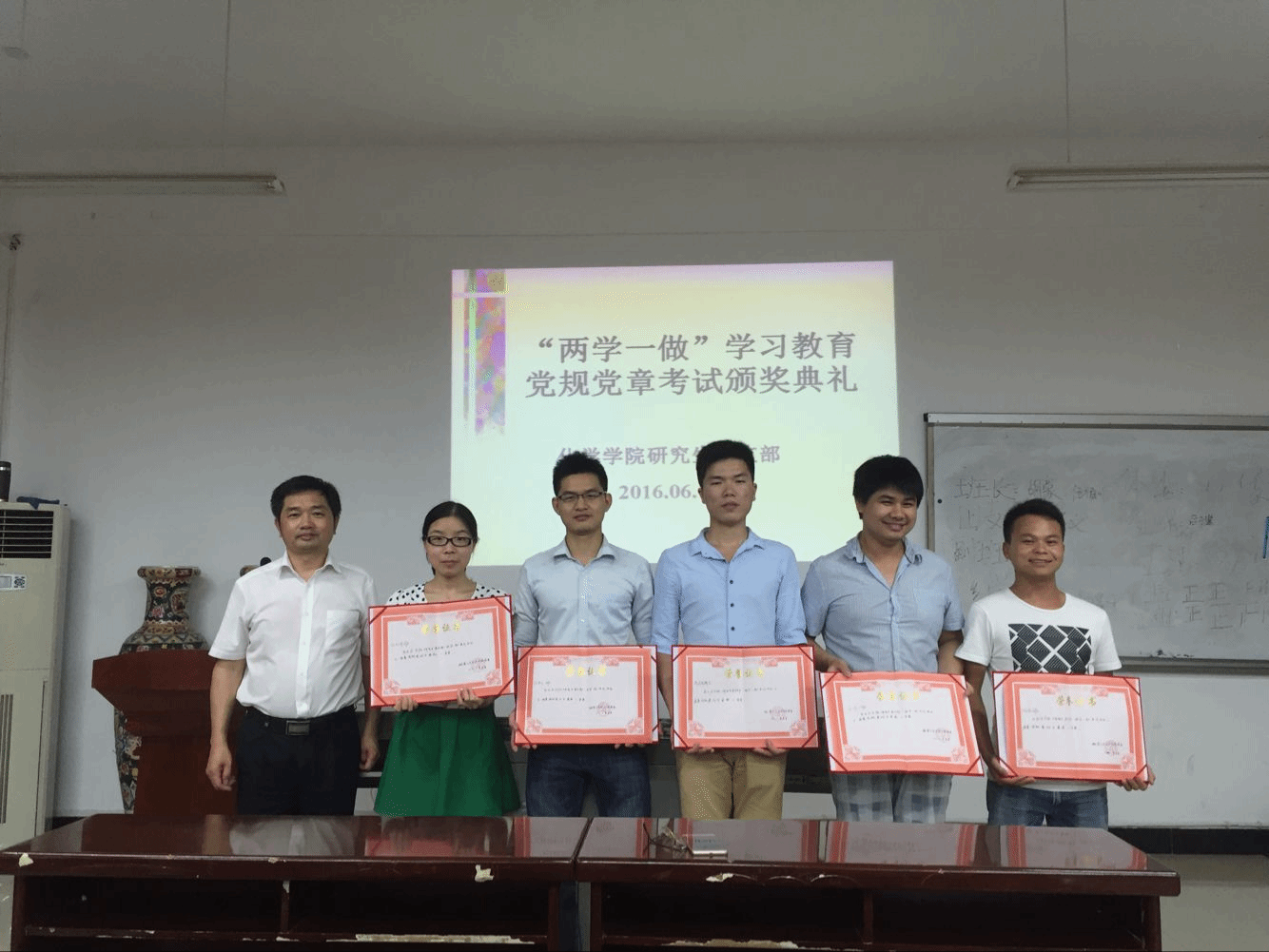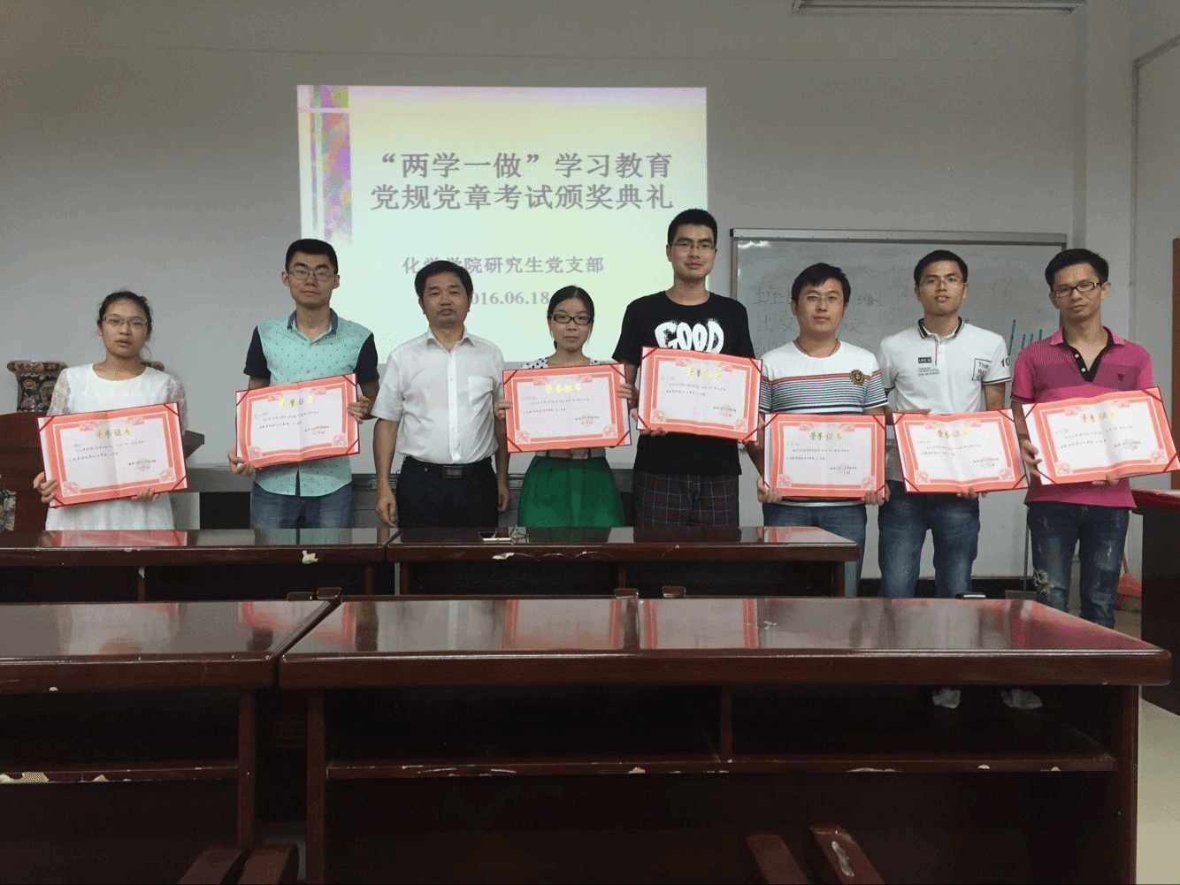 有机研究生党支部还对开展“两学一做”学习教育以来,在党规党纪考试、心得体会文章的优秀者进行表彰。学院党委书记刘稳丰同志担任颁奖嘉宾并与获奖者合影。刘书记指出,学院通过多种形式组织开展“两学一做”学习教育系列活动,促进党员真学真做,并取得了预期效果,希望各党员继续发挥先锋模范作用,以自己良好的言行诠释合格党员的标准。(照片由张俊提供)