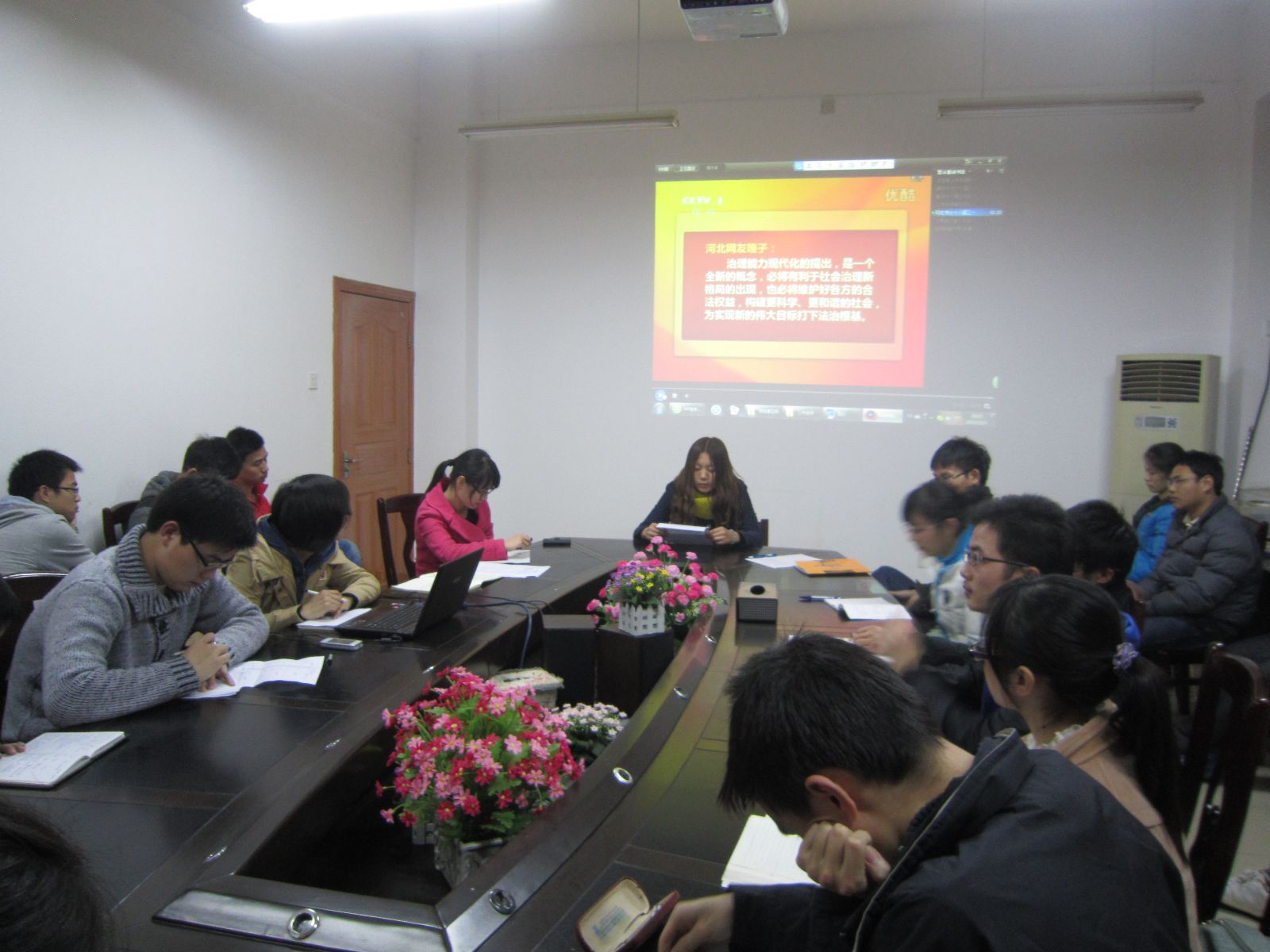 党员同志们首先观看了对十八届三中全会内容解读的三个视频材料,即十八届三中全会的十大亮点、国际社会对十八届三中全会的看法、国内外对中国的期待,从而对十八届三中有了一个整体的认识和把握。
