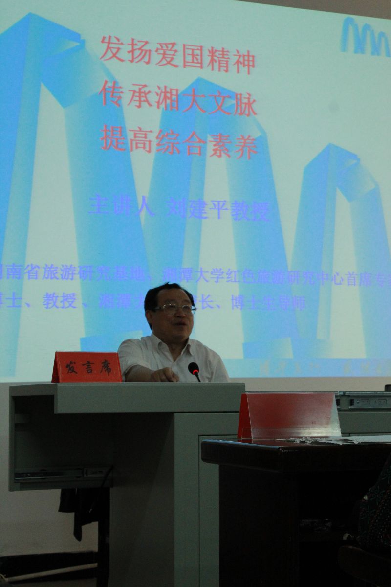 刘校长以社会主义核心价值观导入,向同学们提出了什么是爱国主义,怎样理解爱国主义的内涵等问题,详细解析了爱国的基本含义和要求。而后,刘校长介绍了湖湘文化和伟德BETVLCTOR的历史渊源,对我们提出了传承湘大文脉、宣传湘大校风和精神、提高综合素养的要求和希望。刘校长宽厚熟练的文史知识、风趣幽默的授课风格获得大家的阵阵掌声。