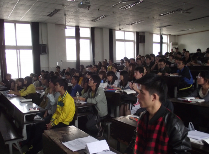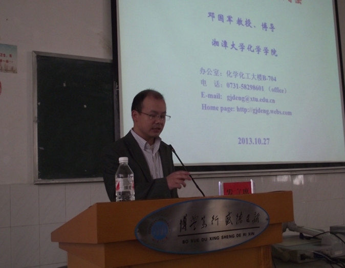 在刘稳丰简单介绍邓国军教授的求学之路和主要成就后,邓国军教授以自己的家庭背景切入,说明态度引导人生航向的道理;从介绍化学各专业研究方向和就业前景入手,说明扎实的专业功底对技术工作的重要性;结合自己的国外合作科研的经历,说明出国留学与眼界开阔的关系;以一张张在国外拍摄的图片,生动展示国外部分高校的学习环境与文化特征,与同学们分享人生感悟;以自己在国内努力工作的经历,阐述人生如何成长成才成功,勉励同学们积极上进,严格要求,做一名优秀的共产党员。