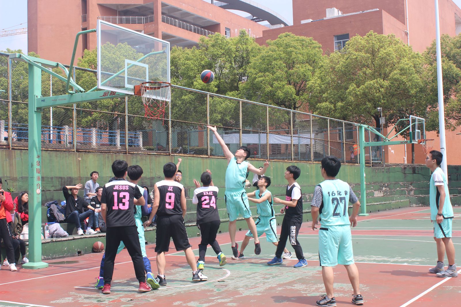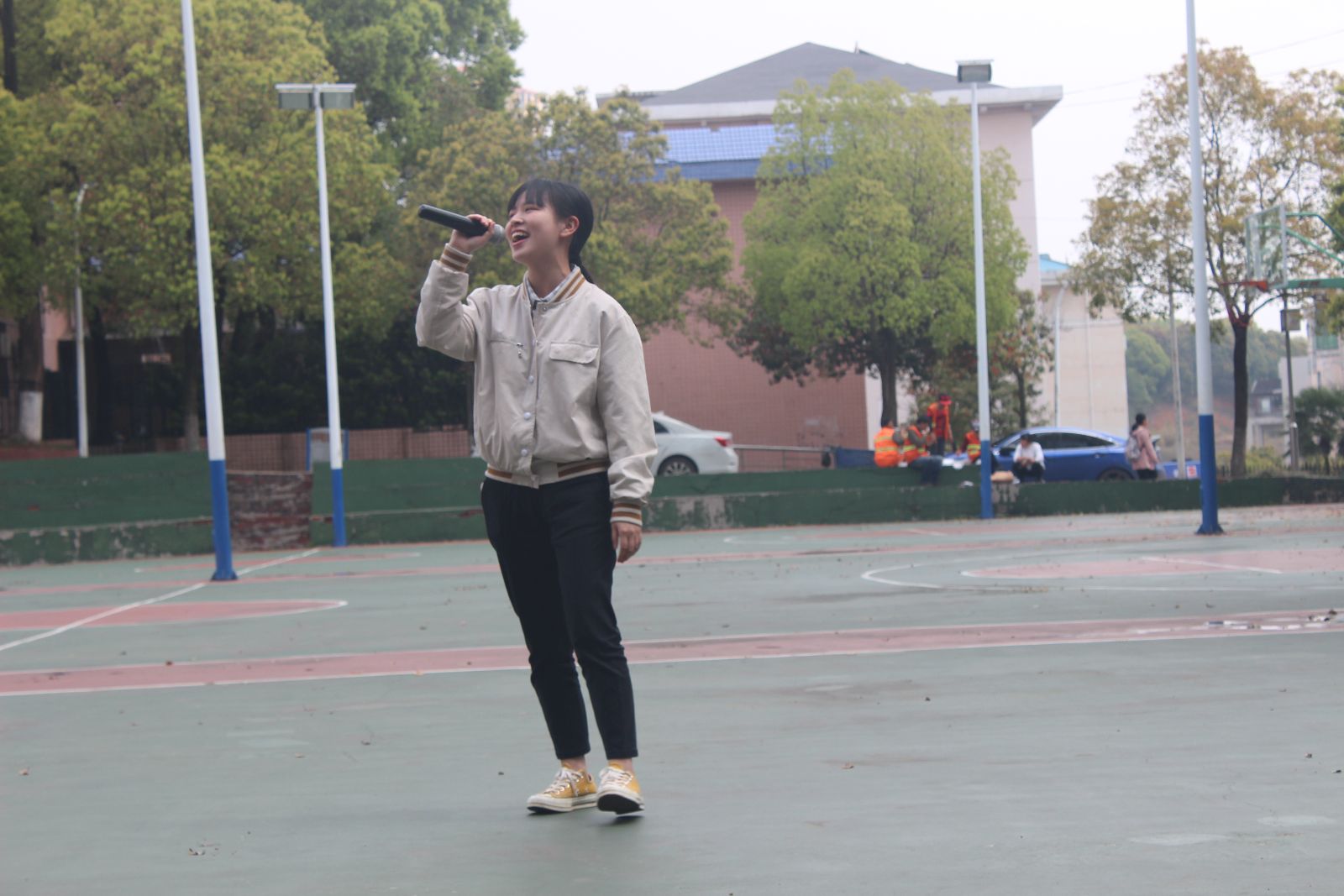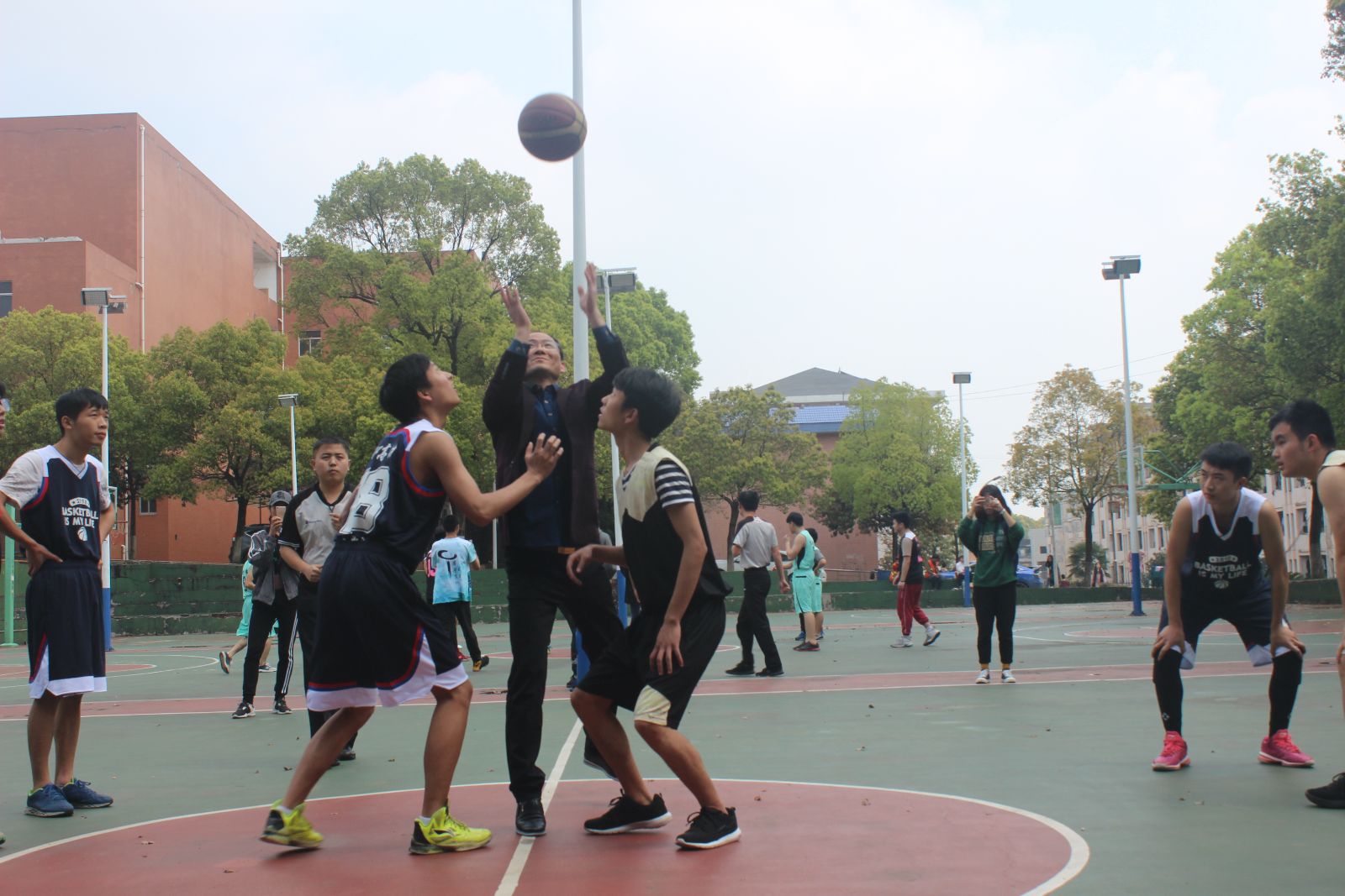 16级应用化学2班李滋滋同学献上开场曲《fly away》为同学们加油助兴。主持人宣布本届“院庆杯”篮球赛正式开始后,李书记和肖书记为球员们开球。