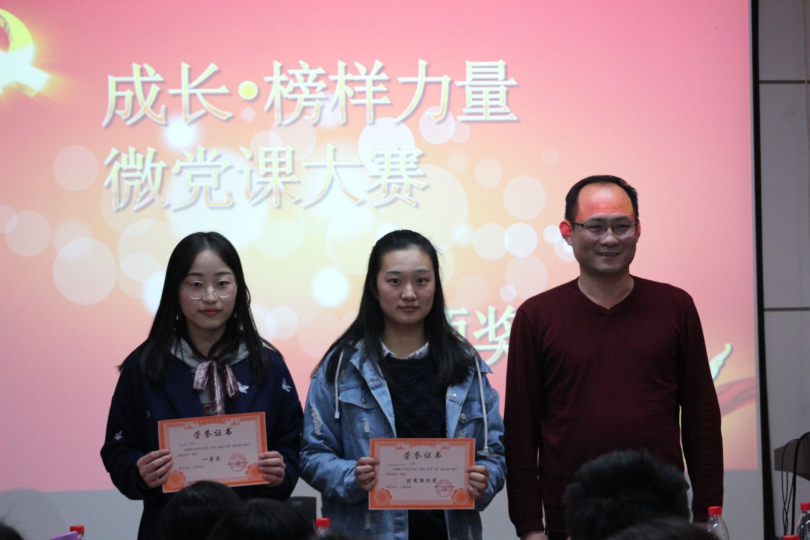 赛后,由现场嘉宾为获奖选手颁发奖项并合影留念。此次活动旨在提高入党积极分子和学生党员的党性修养,为他们提供一个交流和学习的机会,并引导广大党员和人民群众对标先进、见贤思齐,奋发有为、扎实工作,鼓励支持全体师生将《榜样》中优秀党员事迹和身边优秀党员的精神有机结合,向学习和生活中的榜样看齐,身先垂范,做好表率。至此,“成长·榜样力量”微党课大赛圆满结束。