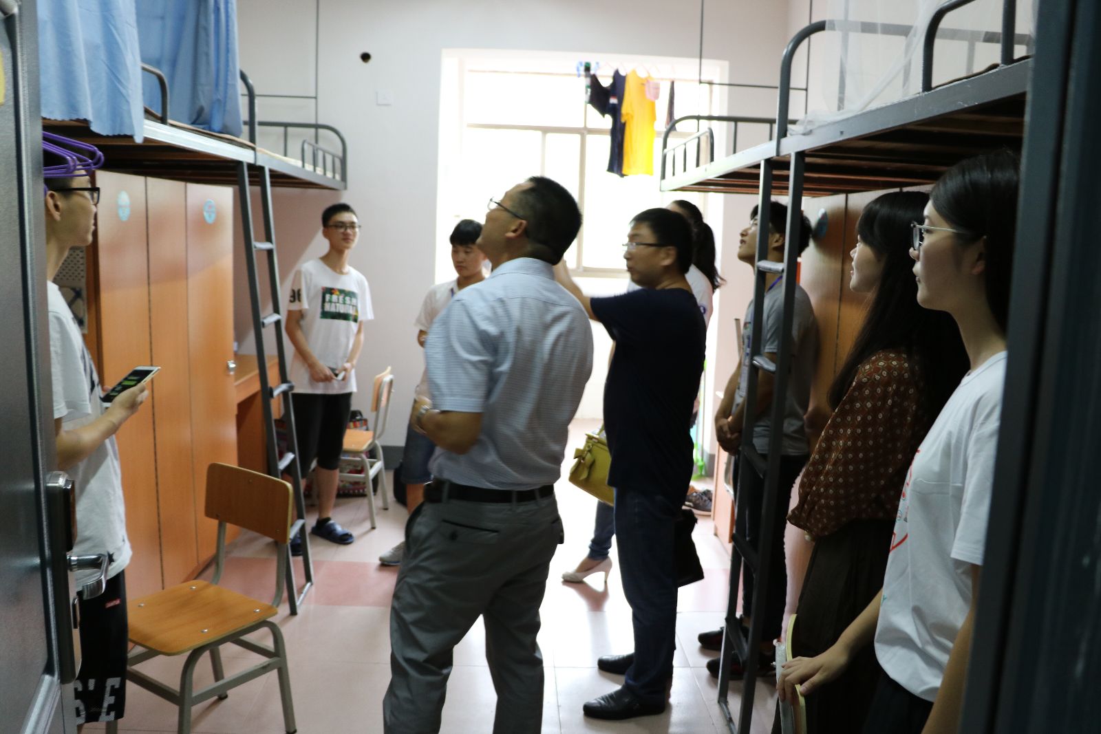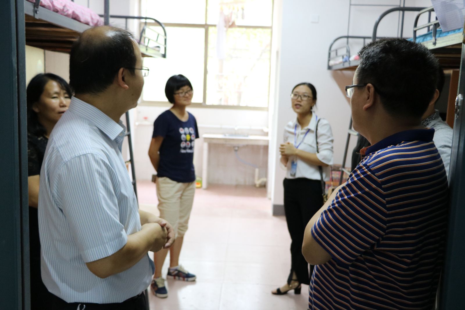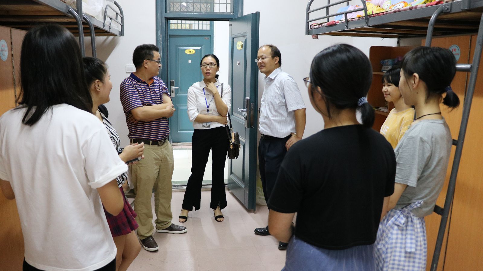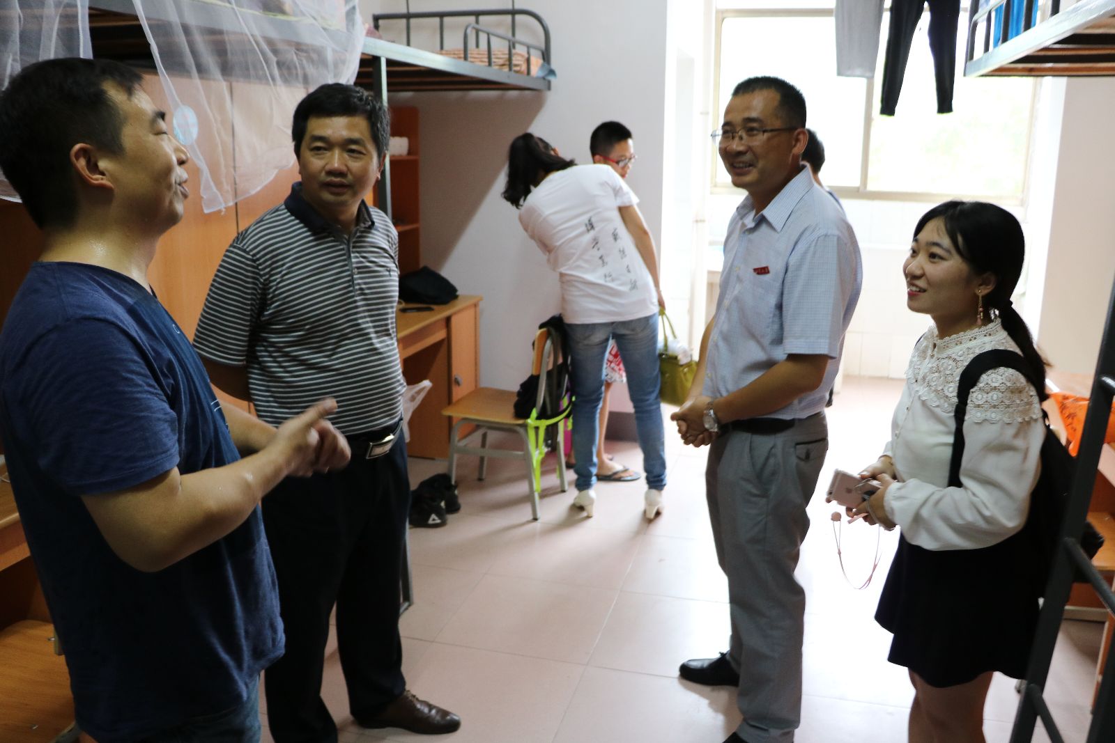 在新生宿舍里,领导们亲切地同新生及家长交流, “从哪里来的?路上辛苦吗?”领导们平易近人的与新生们拉着家常,贴心的话语让新生们不再拘谨,轻松地跟着聊了起来。在和家长的交谈中,领导们表示,学院会尽全力做好新生各方面入学工作,让同学们尽快适应大学生活。