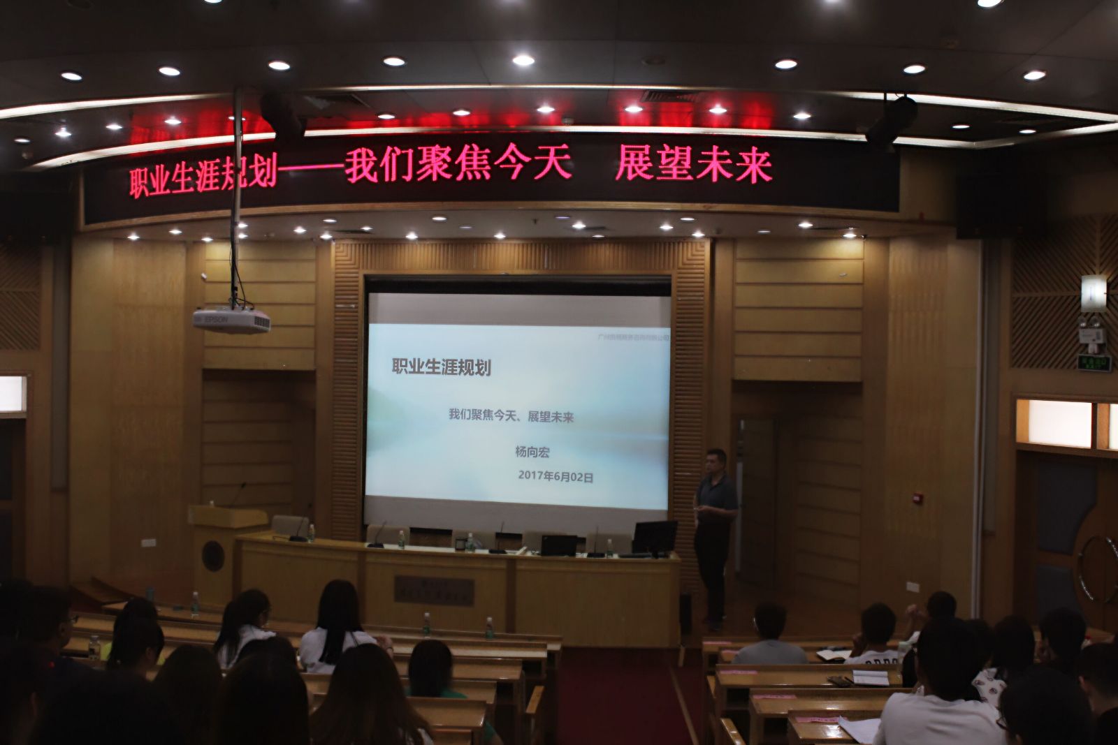 杨向宏先生围绕“聚焦今天,展望未来”的主题,并结合他自己的切身经历,向我们讲述大学生毕业就业出现的普遍问题,又根据现今大学生的思维方式性格特点等向我们提出了建议,教给我们合理规划职业生涯的办法。杨先生语言风格幽默,平易近人,讲座氛围轻松愉悦。