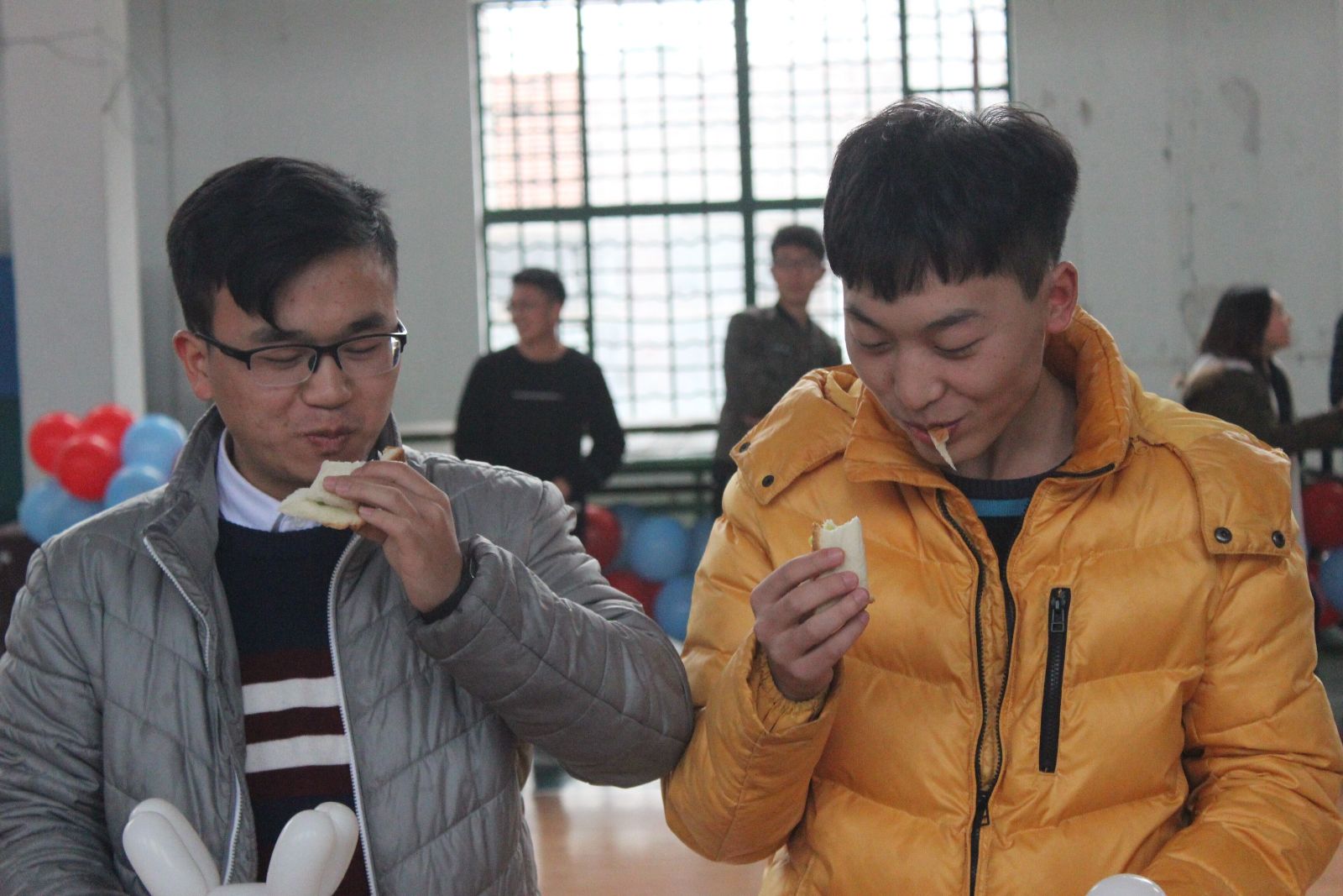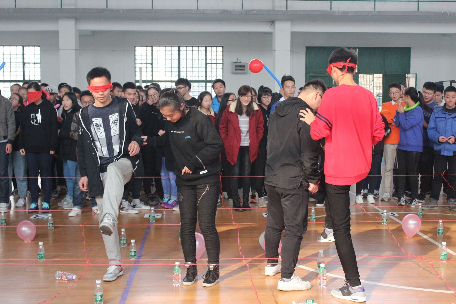 在团委副书记王栋致辞后,本次活动拉开了序幕。活动共有5个环节,每个环节都分成7组进行游戏。首先进行的是“地雷阵”,两个人一小组,一名同学蒙住眼睛,另一名同学指挥,避免踢倒游戏区域里的矿泉水瓶,并踩爆装有奖惩说明小纸条的气球,顺利走到对面后,下一组同学继续出发,直到所有同学完成后,根据踢倒的矿泉水瓶数及奖惩小纸条的内容,每个部门的部长接受吃芥末面包的惩罚和小礼物的奖励。接下来是两人三足乒乓球接力赛,解手环,圆环过人桥,信任背摔等游戏。不仅考验大家的勇气与默契,还加深了彼此的信任。游戏简单有趣,整个活动中大家团结协作,笑声、欢呼声不断。