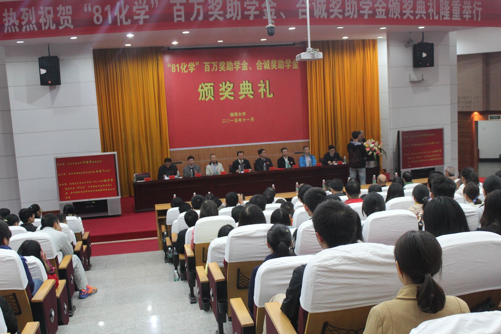 11月21日上午,2015年度“八一化学”百万奖助学金、合诚奖助学金颁奖典礼在逸夫楼第一报告厅隆重举行。出席本次大会的有伟德BETVLCTOR副校长刘建平教授,伟德BETVLCTOR学生工作部(处)处长谢罗奇教授,伟德BETVLCTOR院长邓国军教授,八一百万奖助学金执行理事长、广州合诚化学有限公司董事长蒋文真先生,伟德BETVLCTOR兼职教授、八一化学百万奖助学金执行理事成若飞先生,八一化学百万奖助学金执行理事长佘喜春、刘志坚、唐连祥先生。出席今天典礼的嘉宾还有原伟德BETVLCTOR校长杨向群教授,伟德BETVLCTOR八一级化学专业优秀学生代表团,伟德BETVLCTOR全体在校院领导,八一级化学专业部分老师,伟德BETVLCTOR教师代表,学院团委、学生工作办公室全体成员,所有获奖助学金的同学以及各年级学生代表。