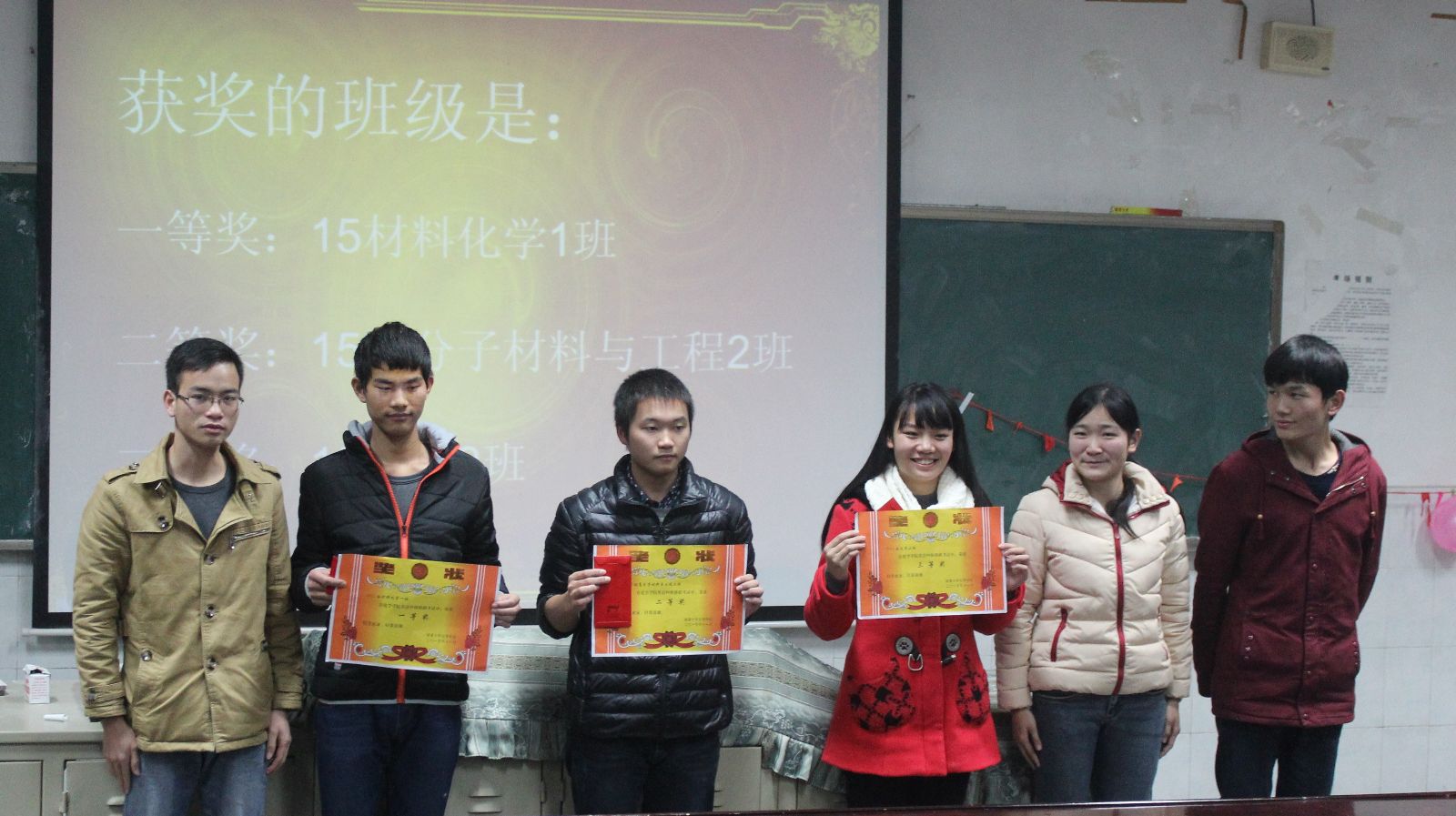 紧接着就来到了本次大会的高潮——颁奖环节,化学二班获得集体三等奖,髙材二班获得集体二等奖,材化一班获得集体一等奖,药学一班方欣、化学二班徐朝强、药学二班周逸威获得个人三等奖,应化二班邵明琪、化学二班刘琳获得个人二等奖,化学一班刘凡同学获得个人一等奖。
