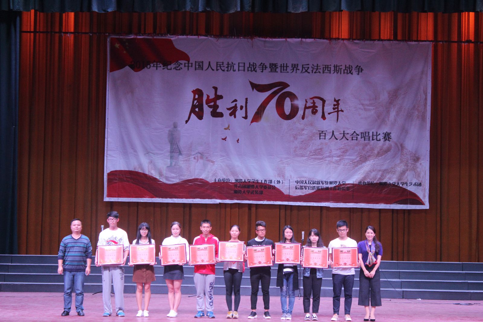 21点40分,本次比赛在伟德BETVLCTOR校歌歌声中落下帷幕,并举行了颁奖典礼,伟德BETVLCTOR的同学们经过长期努力在本次比赛中荣获“优秀组织奖”。此次百人大合唱真切地表达了湘大全体教职员工及学子对抗日战争及反法西斯战争中牺牲的英烈的缅怀,唱出了广大湘大学子对祖国的无限热爱和复兴中华的远大志向,同时也唱出了湘大学子铭记历史,努力学习,艰苦奋斗,为中华民族的伟大复兴添砖加瓦的决心。