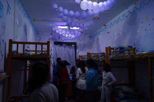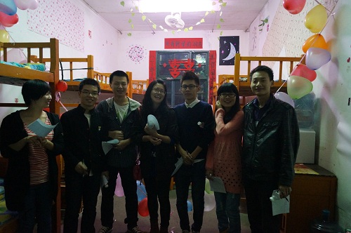 在南苑寝室中,多了一间神秘的“洞房”,它就是309寝室的“没有新娘的洞房” 。轻轻推开门,在红色柔和灯光的照耀下,房间里溢出来的都是满满的喜庆,映入眼帘的是大红“囍”字。墙的两边是纸剪的太阳和月亮,象征日月同辉。穿过有气球组成的心形拱门,来到寝室中央。桌上的书摆成花状,床上的被子叠成双层与洞房婚被和谐统一。水筒、洗漱用品也摞高寓意步步高升。在优雅“梦中的婚礼”的旋律下,仿佛置身在新房之中,只等着新娘的到来。