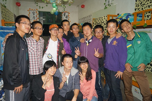 刚从军训军营中走回的我们,来到了一处营地,那便是401寝室。他们的主题是兄弟连,来自军训的启发。寝室的十人是相亲相爱的十兄弟。走进寝室,扑面而来的是军营的气息。藤蔓围绕的天花板所形成的“丛林”让寝室多了一份绿意。下面悬挂着的纸板大飞机正做着起航状,表示着寝员们整装待命随时为保家卫国准备。两个Q版的大兵守卫着窗边,威武而不失幽默。被铺整齐一致,展现着他们良好的军容军貌。床头贴的古典书法,为这里铁血增添了一丝柔情。