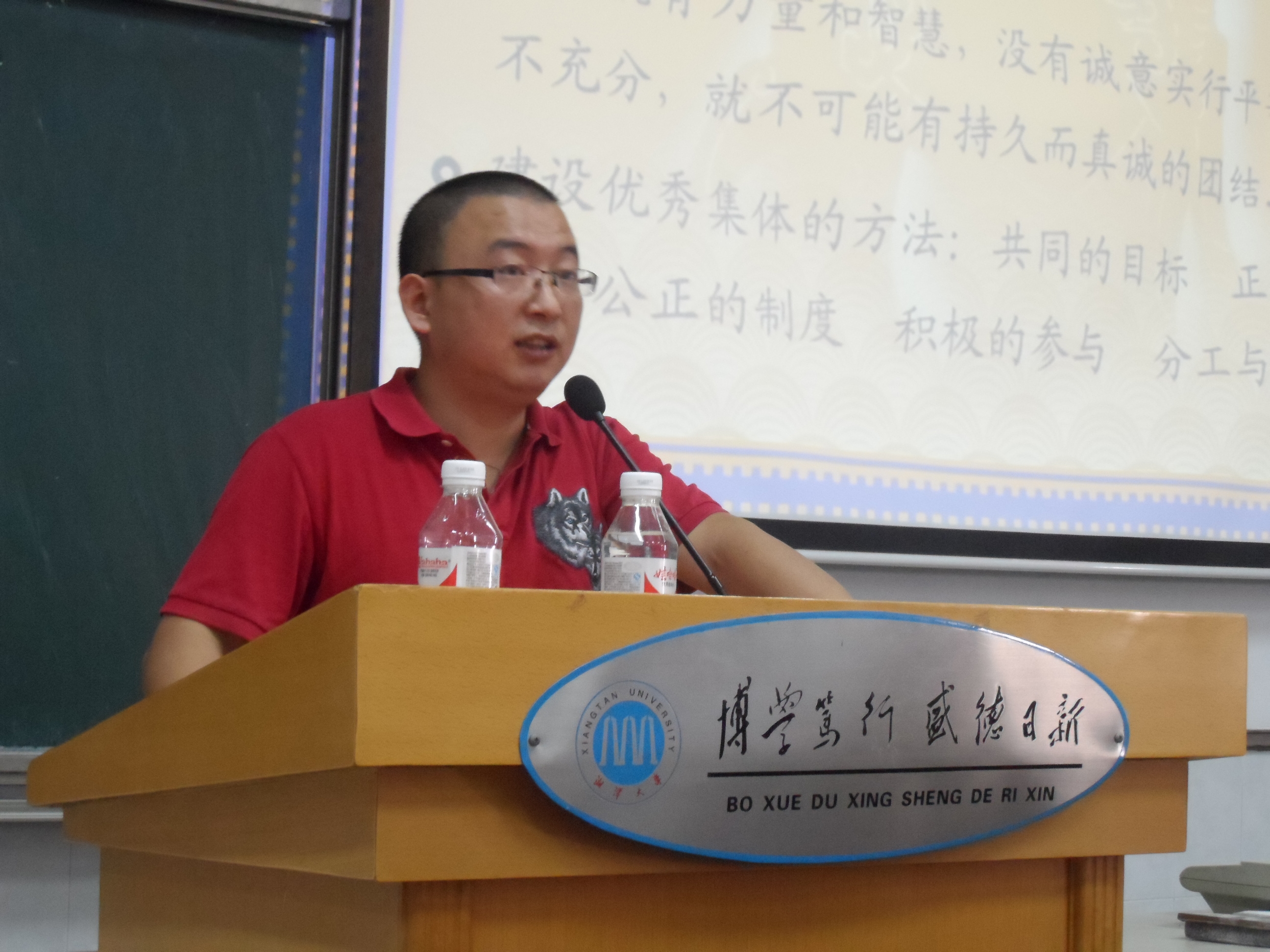 接下来,由周计老师为大家上第一节团课。周计老师围绕“走进大学”这个主题向我们详细地说明了大学生活的特点,面临的问题以及解决方案。周老师幽默的讲课方式赢得了同学们的阵阵掌声。