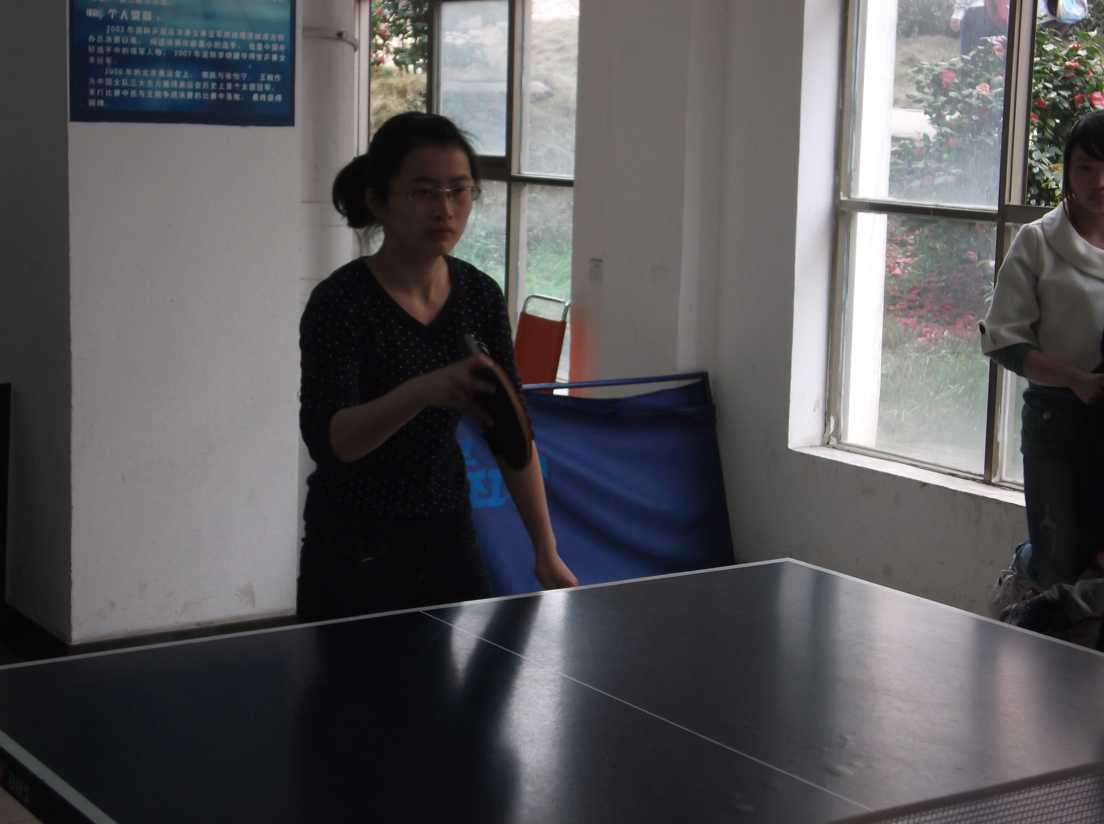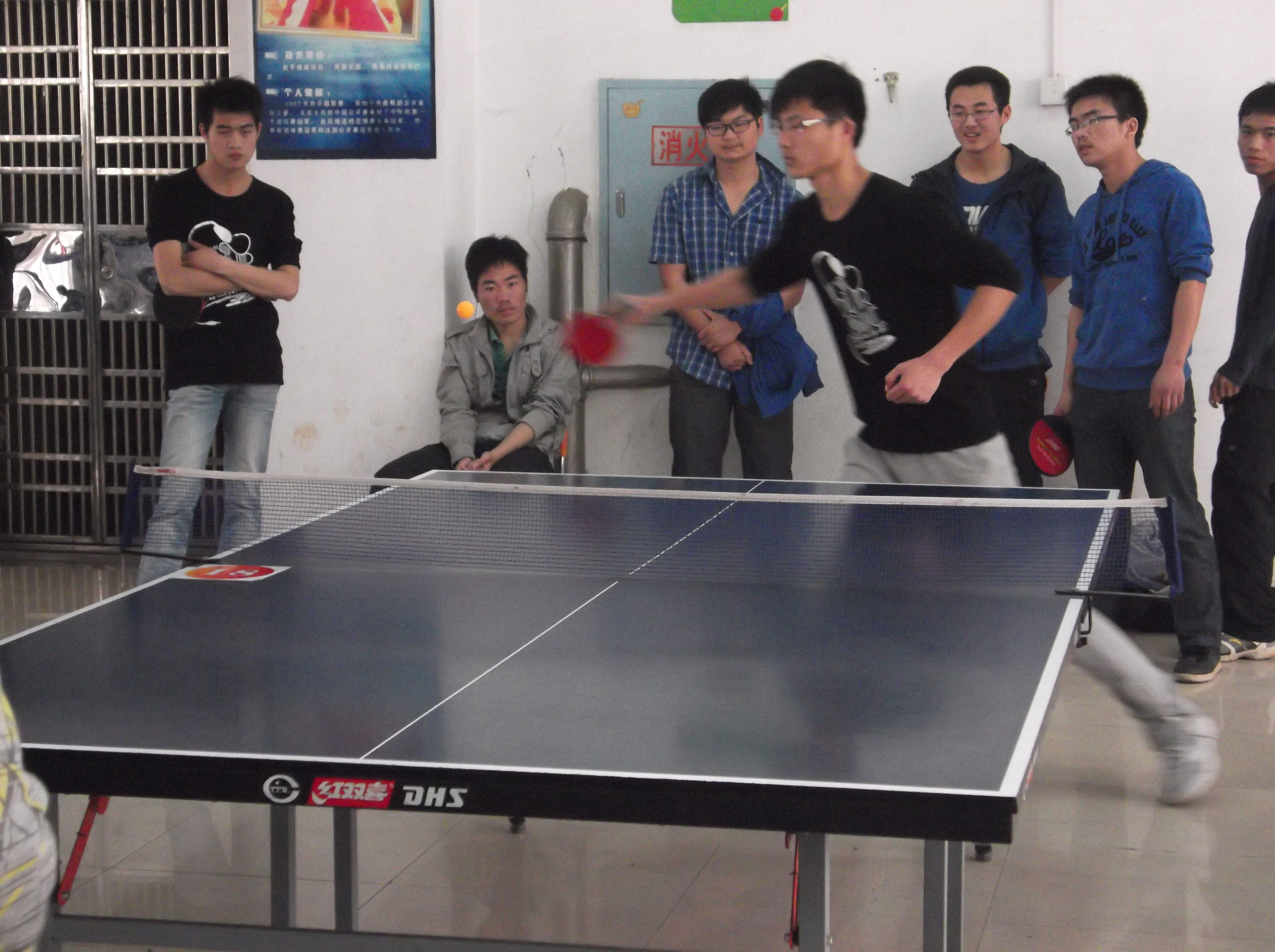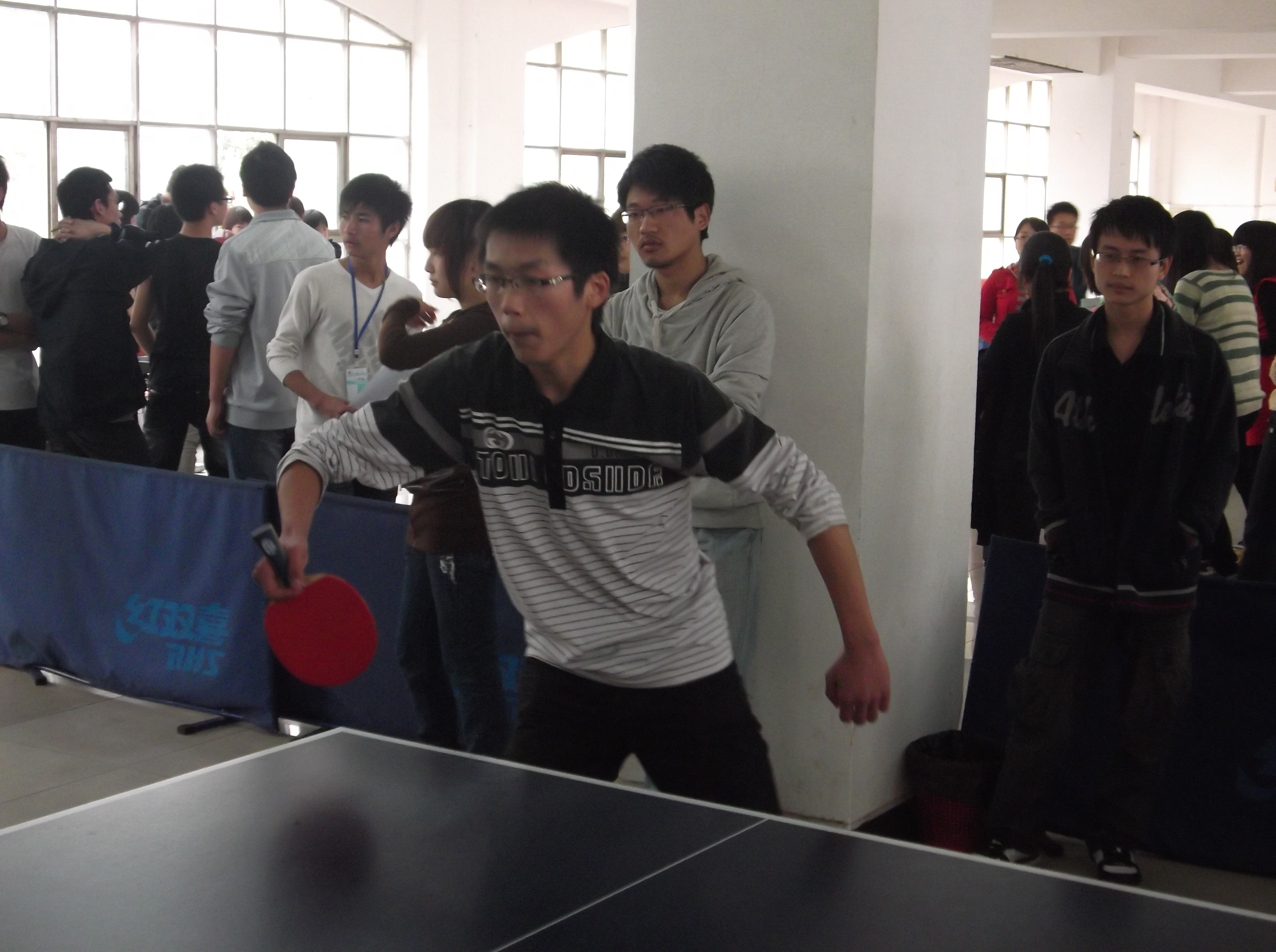 比赛开始之前,乒乓球馆里热闹非凡,有一些同学们已轮流发球进行热身,而有些则是三五成群的在一旁观战,欣赏着一个又一个佳球,不时拍手叫好。比赛开始后,男女生便分开进行比赛,在积分淘汰的赛制下,比赛紧张而激烈的进行着,所有的选手都严阵以待,期望在最佳状态下一举击破对手。