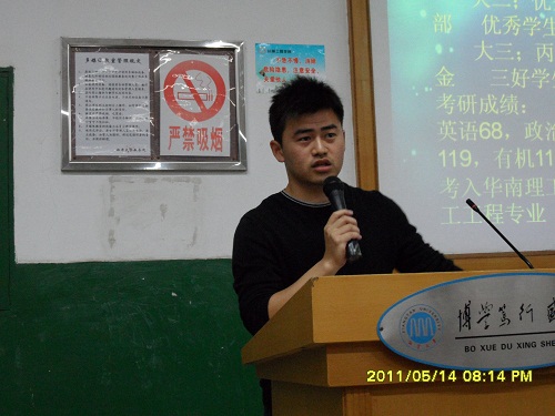 接着,便是优秀考研学长学姐进行经验介绍,他们是来自各专业的考研佼佼者,都以相当高的分数考入了自己理想的学府。首先是2007级化学二班的孟禄程学长,他以390的总分考入了伟德BETVLCTOR,孟学长谈了他当时的复习备考计划,以及相关的初试复试技巧,同学们也都认真仔细地记下他的话。然后,2007级应用化学二班考入浙江大学的朱凉伟学长;2007级高分子材料与工程二班考入上海交通大学的黎燕学姐;2007级材料化学二班分考入华南理工大学的刘杰学长;2007级药学二班考入中国药科大学的顾相应学长也分别给广大学弟学妹们作了经验介绍,他们的发言或幽默风趣,或激情澎湃,在给大家解惑的同时也赢得了大家的热烈掌声。最后是个人提问时间,同学们向各自专业的学长学姐们提了自己最感兴趣或是最疑惑的问题,他们也一一作了热情而详细的回复。
