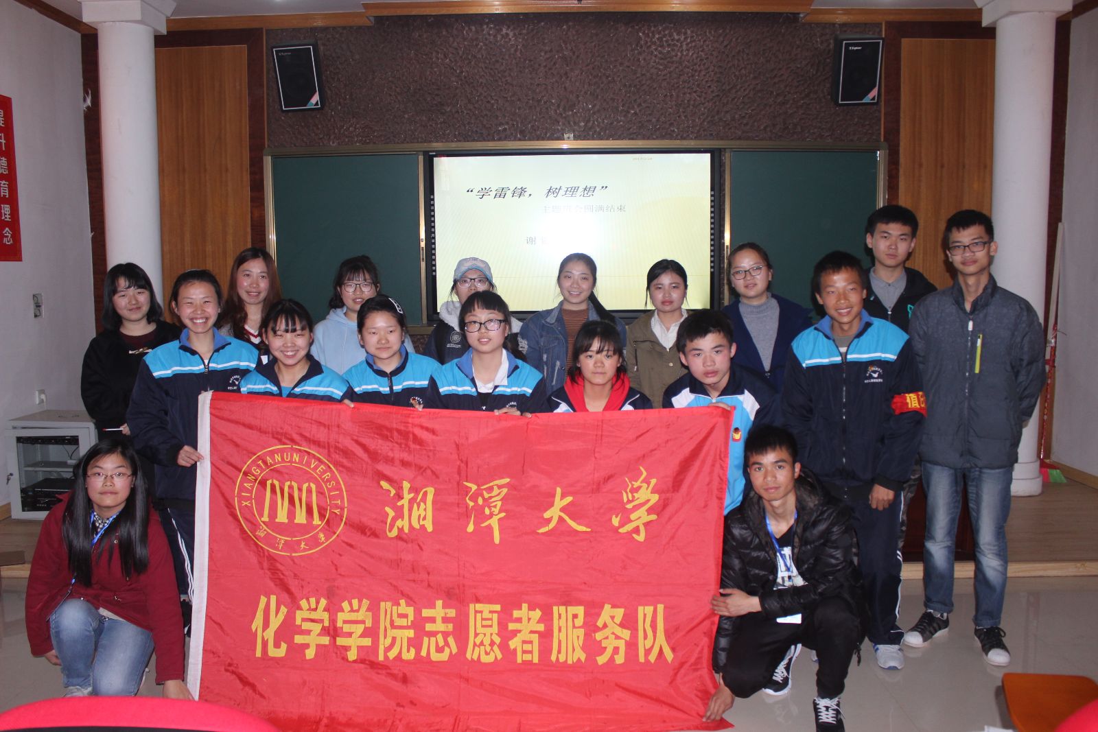 本次活动志愿者们在特殊学校的语湘楼里和高七班的孩子们上“学雷锋,树新风”的主题的班会。活动过程中,志愿者们和小朋友一起学习雷锋事迹,同时在“向雷锋同志学习”的倡议书上签字,又与小朋友们一起做化学实验。班会即将结束,孩子们与志愿者们一起写下自己的心愿,放在小瓶中。