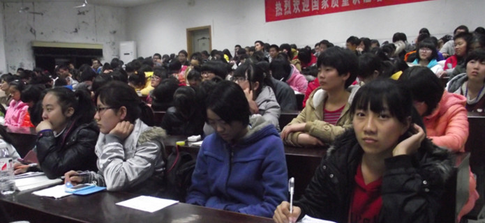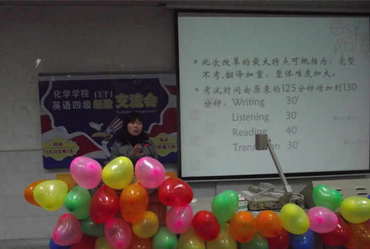 大会由主持人张家鑫宣布开始,由畅致辞。张家鑫请出杨孟然为大家讲解作文和翻译。杨孟然强调写英语作文可以借鉴语文作业的格式——龙头豹尾,特殊句式和字迹的工整也有助于作文分数的提高。左代流利上口的英语开场白让在场口语有待加强的同学们惊羡不已,他鼓励我们以“听力虐我千百遍,我待听力如初恋”的坚持忍耐态度去对待四级听力,争取提高听力能力。然后由张思梦讲解阅读理解部分,简单的方法让大家一目了然。最后大家用热烈的掌声请出深受欢迎的李老师。李老师主要讲了试卷修改、评分标准等方面的内容并对本次大会作出总结。她强调,四级考试并没有同学们想象中那么难,只要努力,过四级很容易。