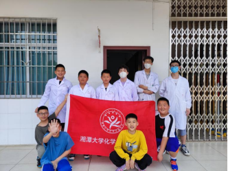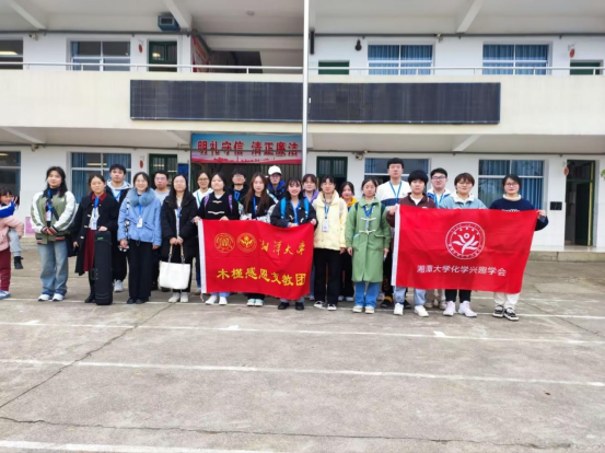 化学兴趣学会成员和木槿感恩支教团在先锋小学教学楼前合影