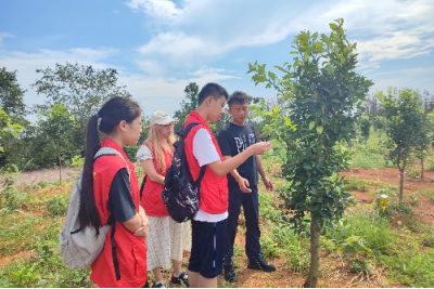 在排头乡合荣村党支部书记蔡治卫、枳壳基地负责人刘欢和其他村支部成员的带领下,实践团来到了枳壳种植基地进行参观调研。据了解,合荣村的枳壳基地自2023年开始种植,至今种植面积已有100多亩。因枳壳种植技术要求较低、价格浮动较小,合荣村从益阳引进成年树苗种植,定期修枝、施肥,并请湖南省农科院教授前来进行技术指导。