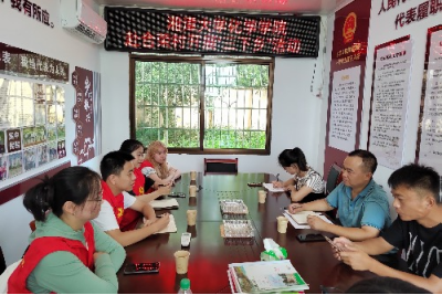 (图为实践团成员与合荣村村委成员于会议室交流图)