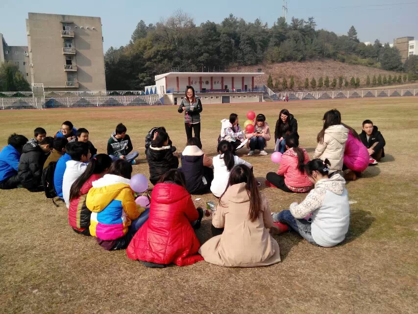 早上八点半全班同学来到了第二田径场,他们有的忙着整理运动器材,有的安排场地,有的跃跃欲试,原本寂静的田径场顿时欢腾了起来。早上九点趣味运动会如期开始,伴随着简单的分组之后,红桃组、方片组、梅花组、黑桃组的人员便开始了运动热身。各组人员信心饱满,摩拳擦掌,各不示弱。紧接着便开始了第一个运动游戏“抛绣球”。同学们全心投入,竭力配合,真正体现了努力拚搏与团队合作的精神。然后进行了第二个游戏“三人四足”这个游戏更体现出了团队合作以及永不服输的精神。同学们腿脚绑连在一起,虽然行动受限,但是同学们都共同努力合作向前脸上洋溢着青春与活力。最后两个游戏是“搭桥过河”和“双腿夹气球接力”,这两个游戏要想取胜不仅需要技巧,更需要体力的支持。游戏之后田径场上完全沸腾了起来。同学们欢乐嬉戏声此起彼伏,额头上大都渗出了丝丝汗水。虽然有些乏累,但是都很快乐。