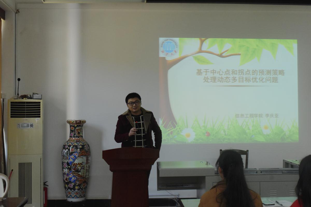 李庆亚,中共党员,信息工程学院计算机科学与技术专业2015级硕士研究生,信息工程学院2015级研究生会学术科技部部长,2017年国家奖学金获得者。发表SCI2区文章1篇。主讲题目:基于中心点和拐点的预测策略处理动态多目标优化问题。主要内容:用预测的方式来解决动态多目标优化问题。