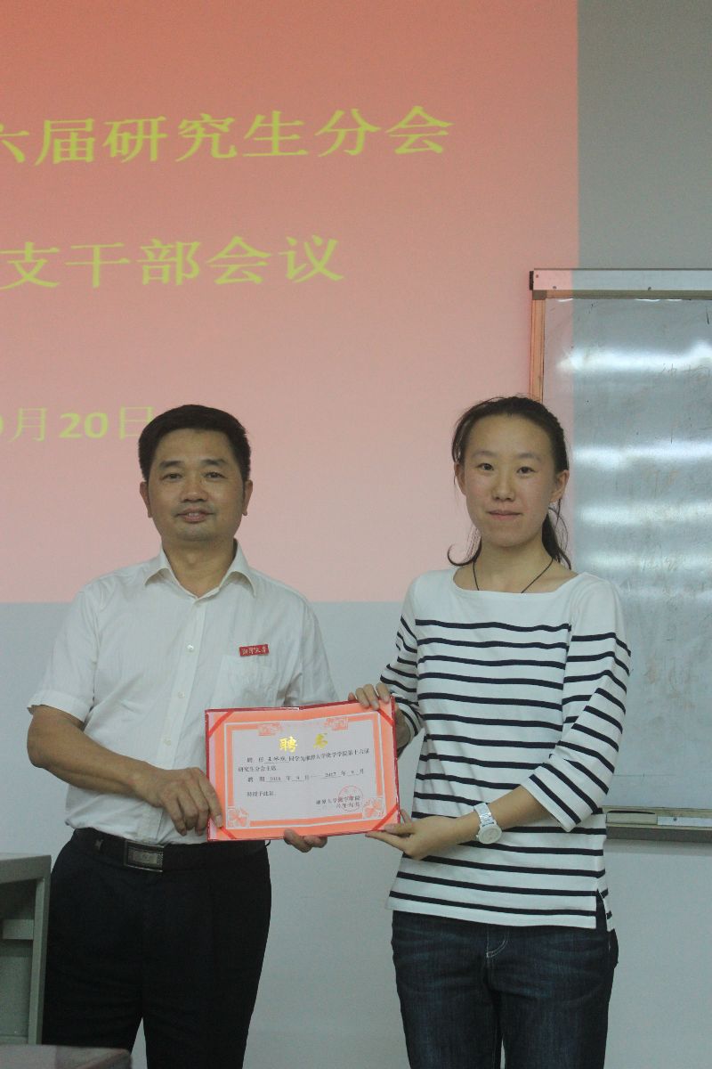 刘稳丰为新一届研究生分会、团总支干部颁发聘书,期间,刘稳丰对新干部幽默的调侃,包含着对新一届干部的信任与期待。